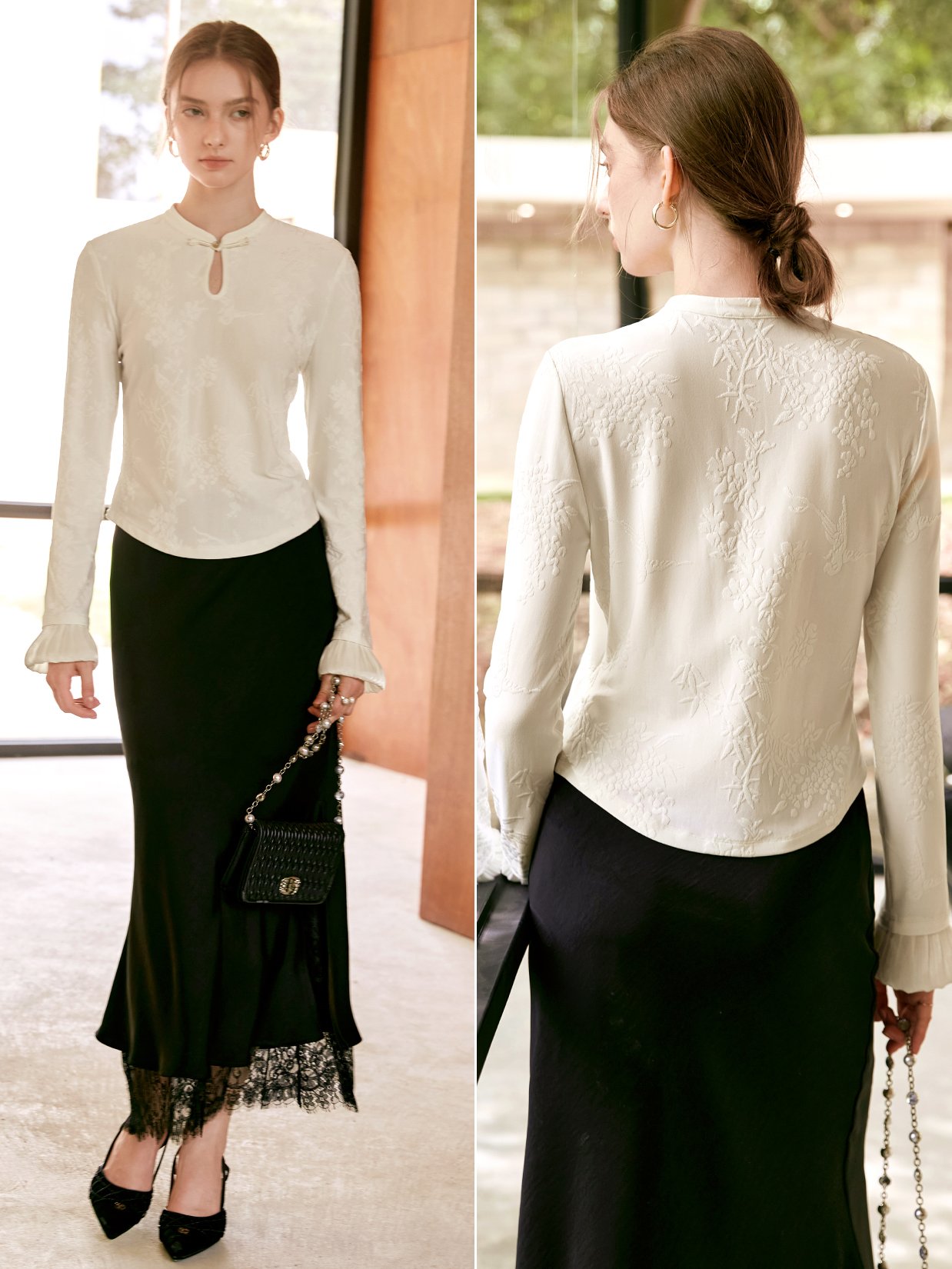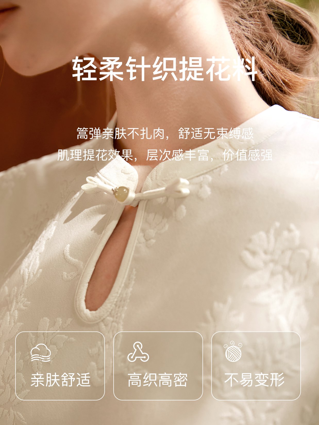 甄选轻柔针织提花料,篙弹亲肤无束,不易变形;提花演绎古典风雅,低调内敛呈现精至品位;国风水滴领,领口定制手工盘扣,凸显东方气韵;袖口拼接纱质荷叶边,举手投足间皆是精至与柔美