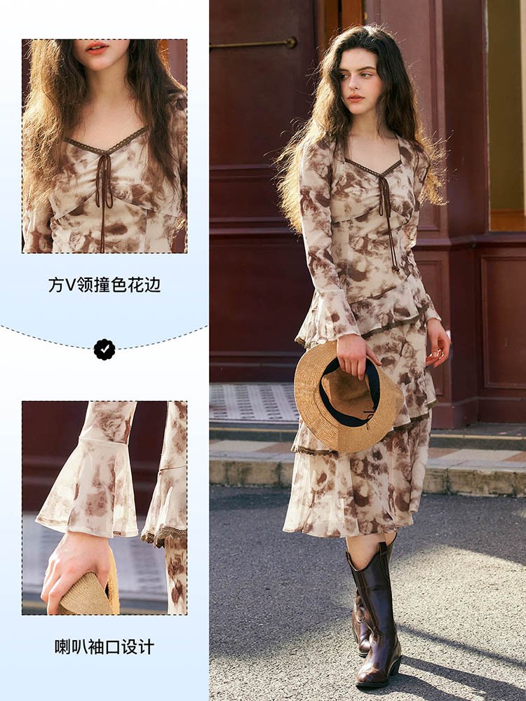 浪漫优雅柔情!荷叶边晕染玫瑰方V领连衣裙