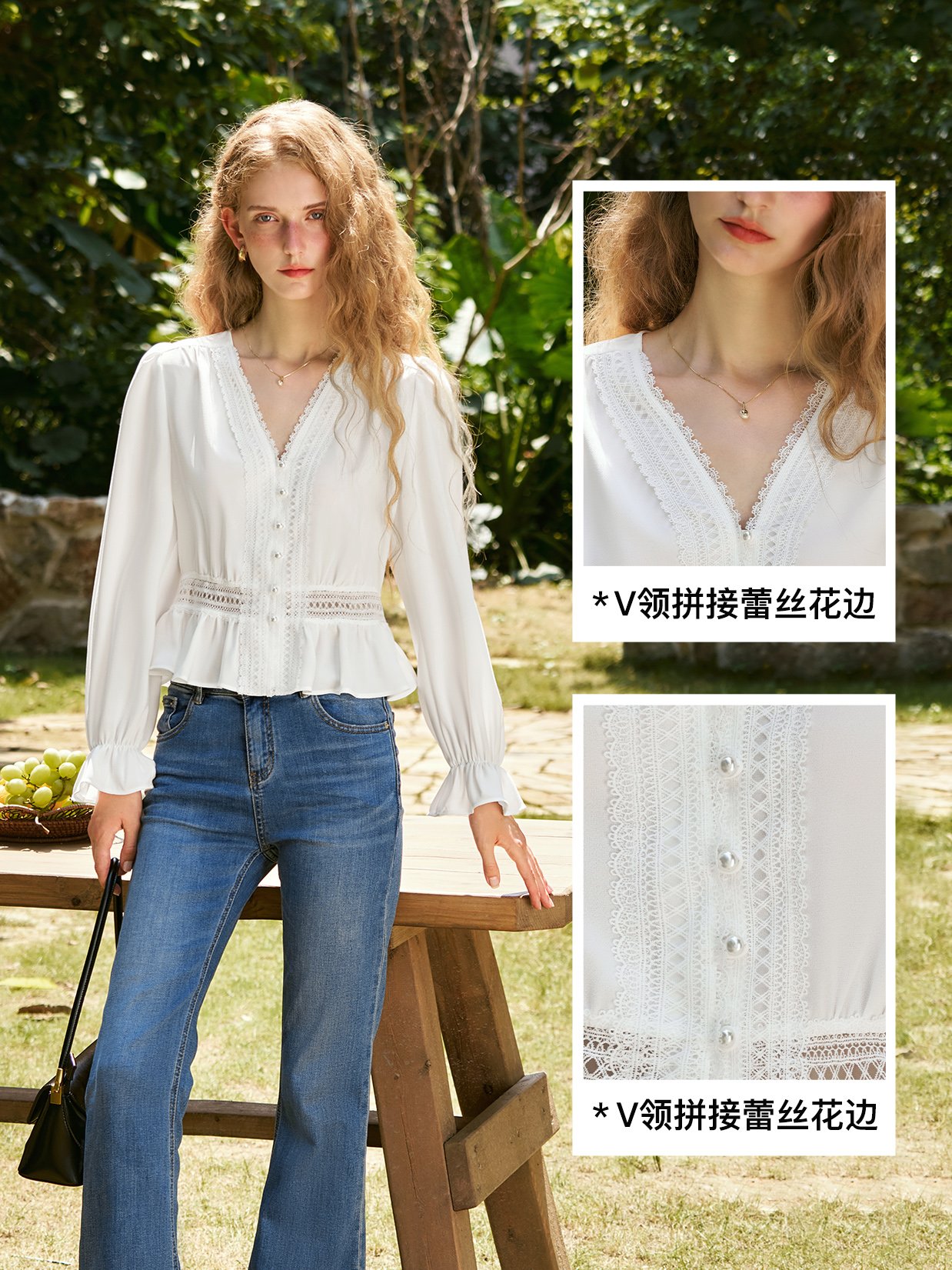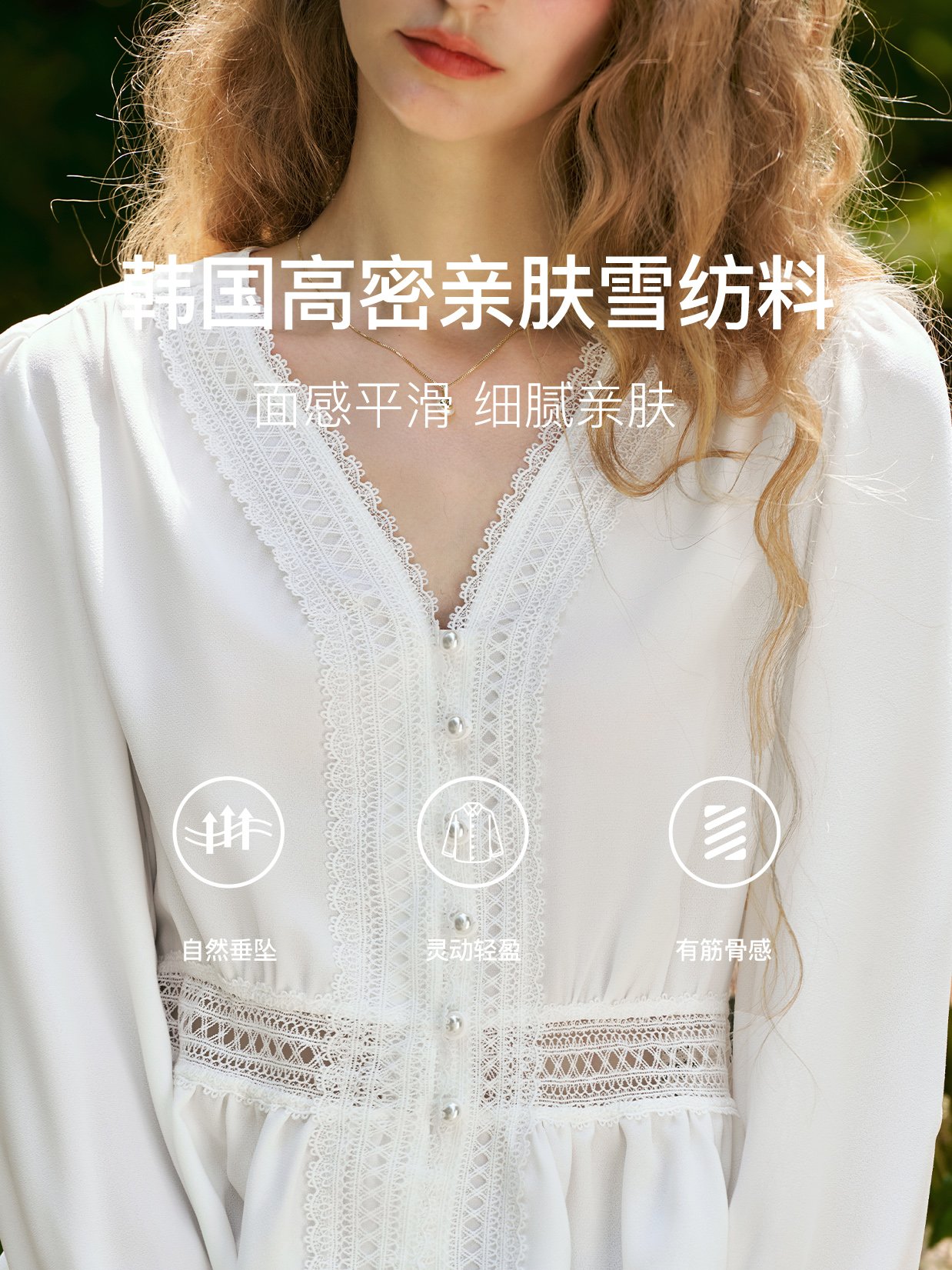 韩国高密亲肤雪纺料,面感平滑,亲肤悬垂;高织高密,保留雪纺的灵动通透感,轻盈解压;V字领拉长颈线,重工拼接蕾丝,增添浪漫细节;前中精至珍珠扣,莹润吸睛,注入華丽灵魂;腰节镂空设计,隐约的露肤度,充满迷人魅力;正肩微泡泡袖提神显气质,袖口荷叶边柔美灵动