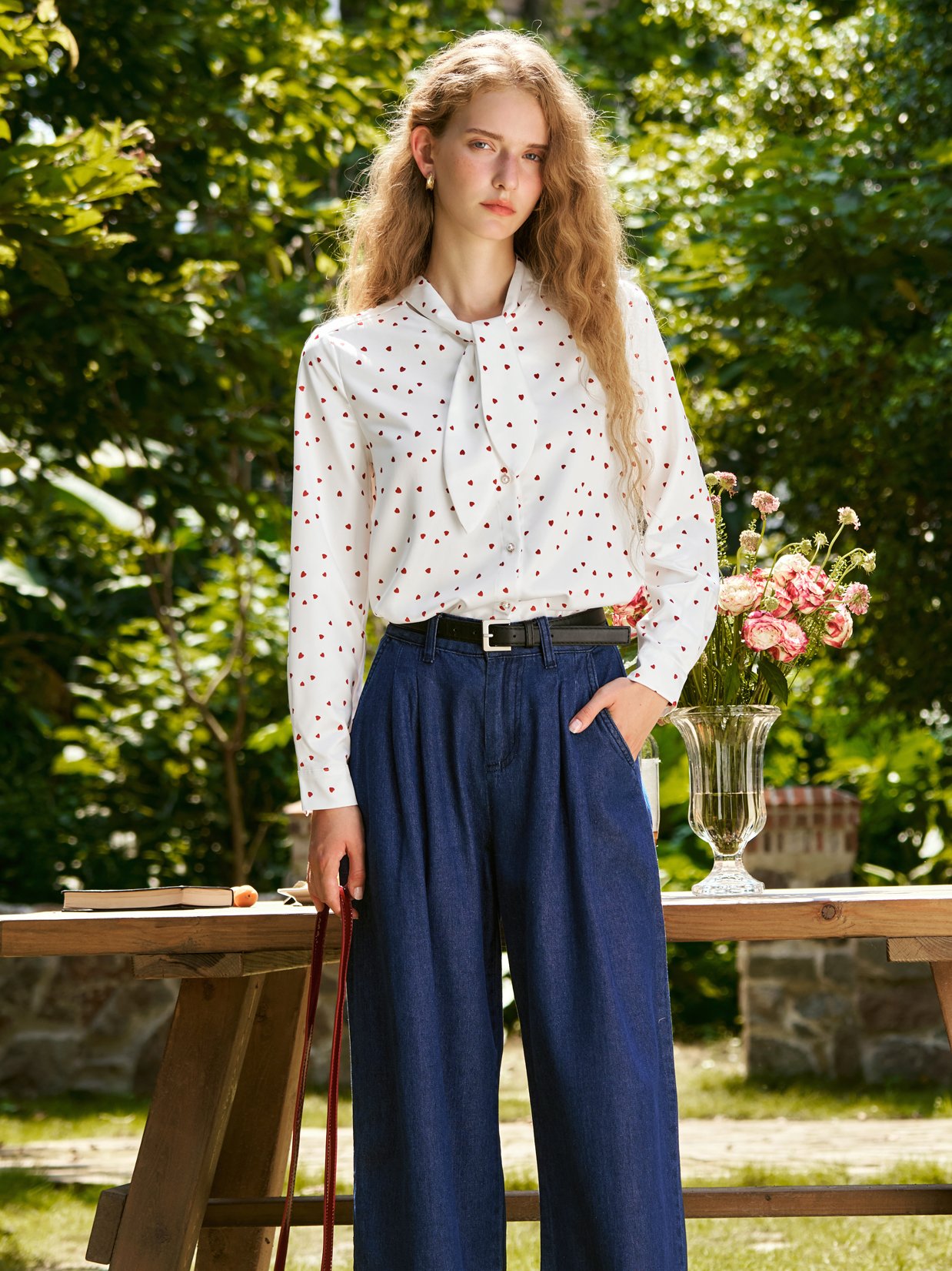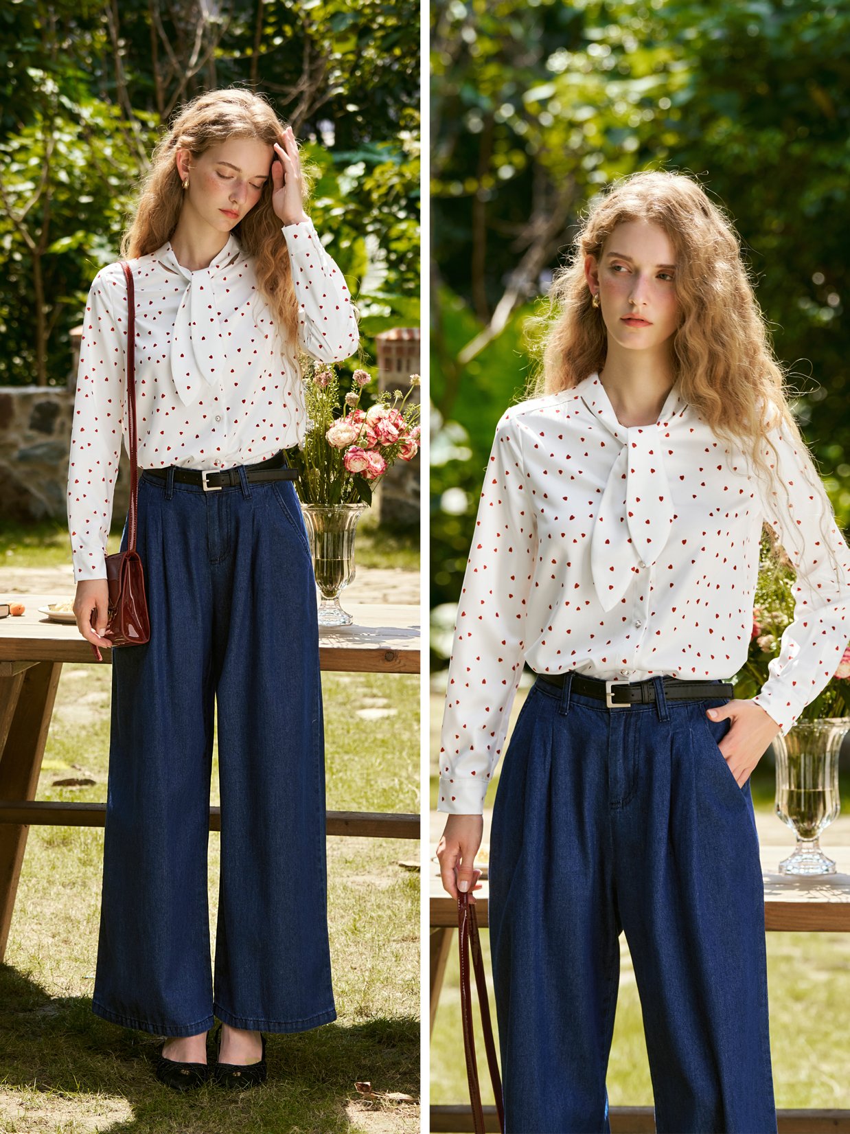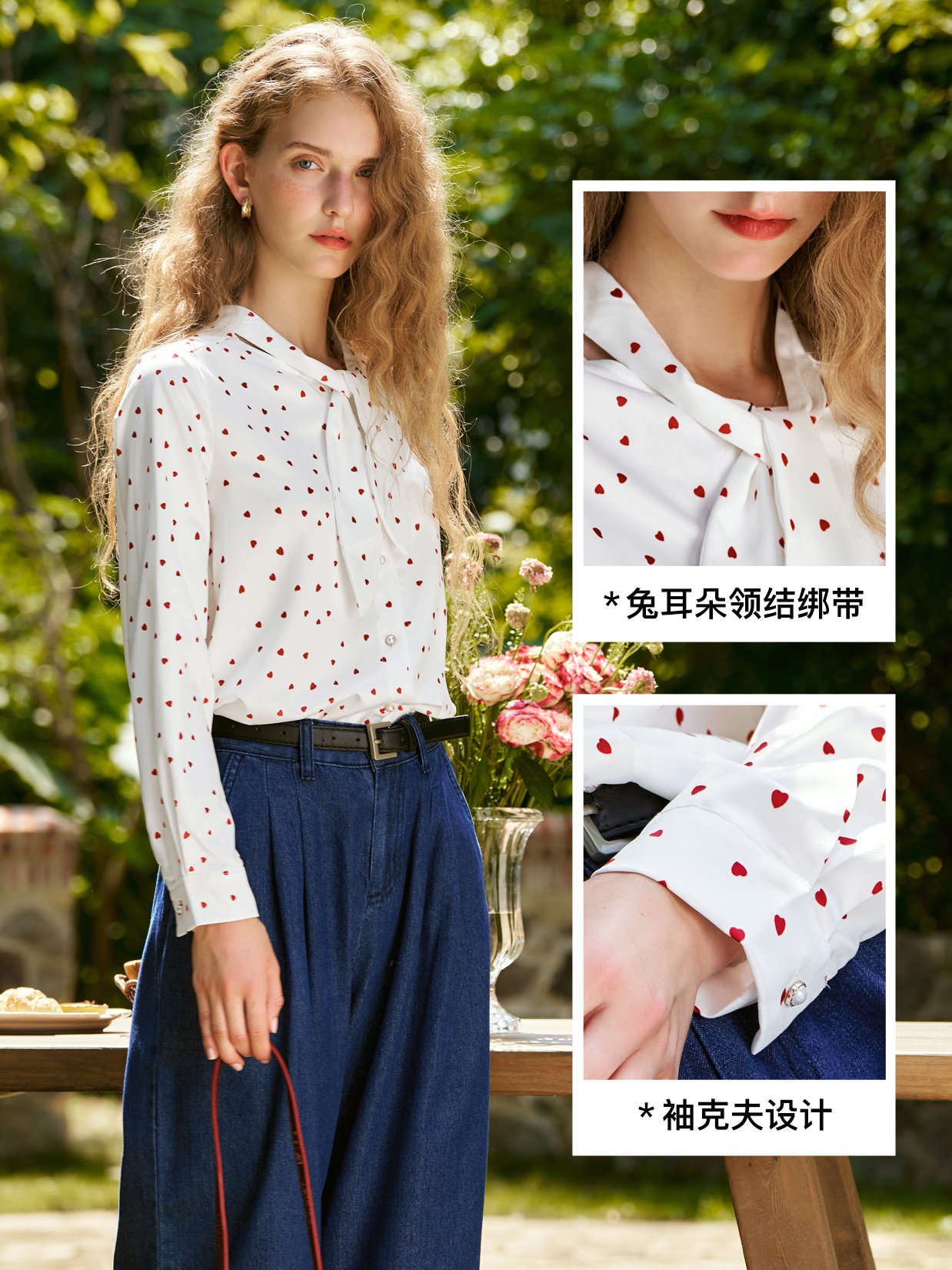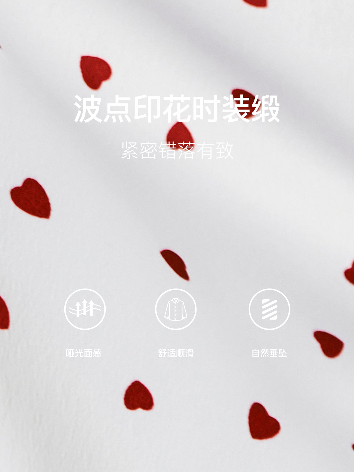 甄选波点印花时装缎,柔软细腻,舒适顺滑;自然垂坠,上身营造出流畅的身形线条美;本布立体裁剪“兔耳朵”领结绑带,趣味十哫;赋予多种造型可能,视觉修长脖颈线条;门襟金边珍珠扣,增添精至细节,方便好穿脱;后背工字褶,丰富立体层次,不会软塌沾身