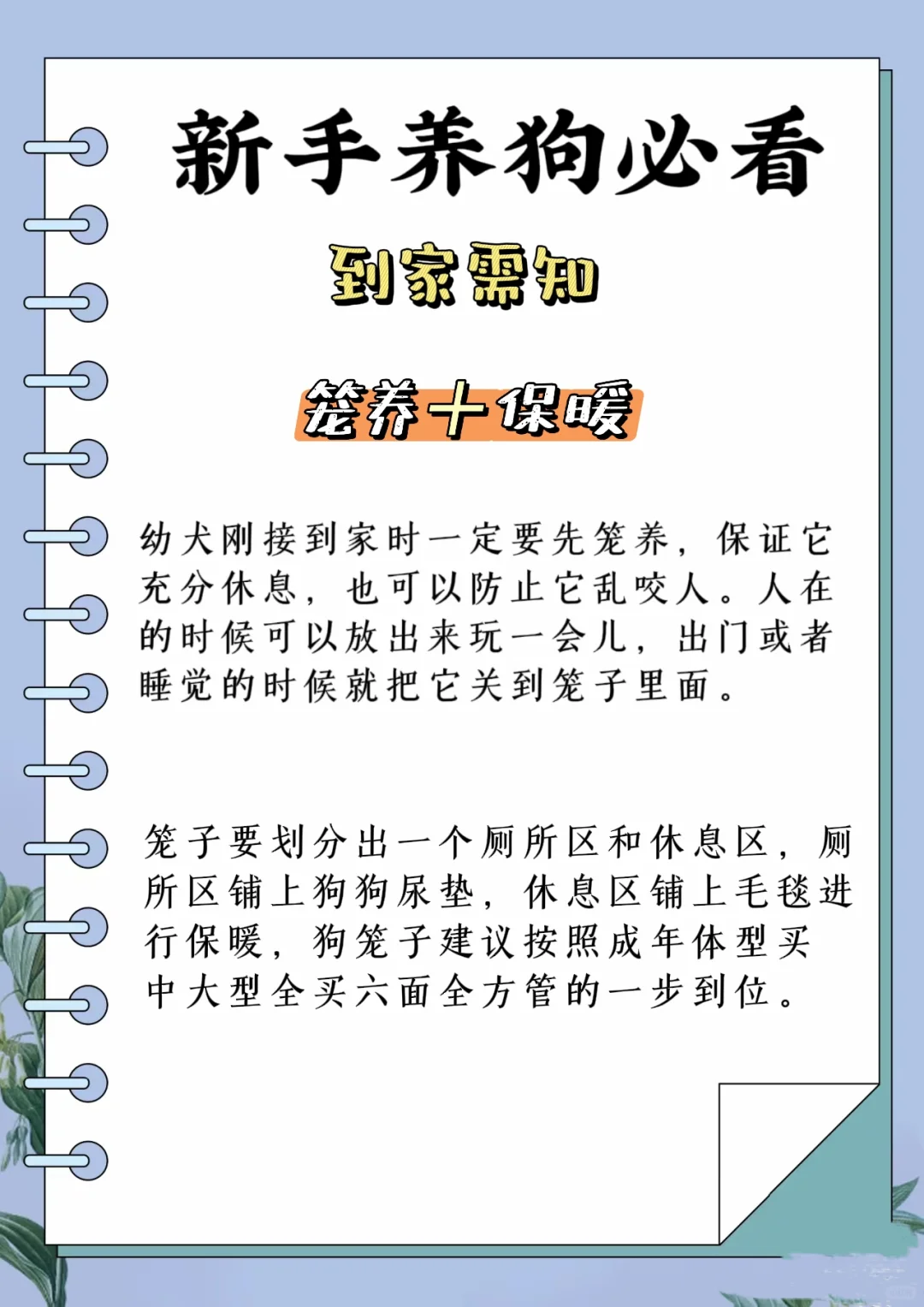 要注意笼养和保暖,笼养既是保护狗狗,也是保护主人,保暖是因为狗狗到新家可能会不适应,容易生病。