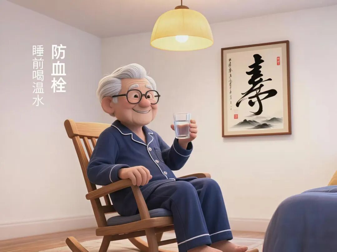 老人睡前喝200毫升水,早晨血黏度会下降,维持血流通畅,防止血栓形成。
