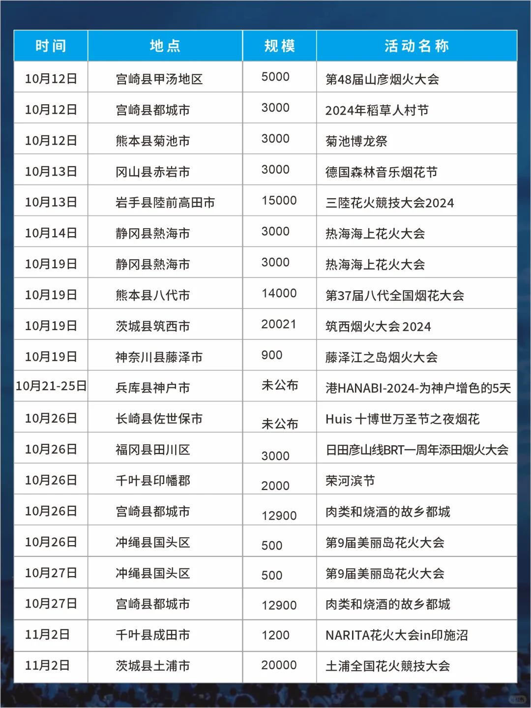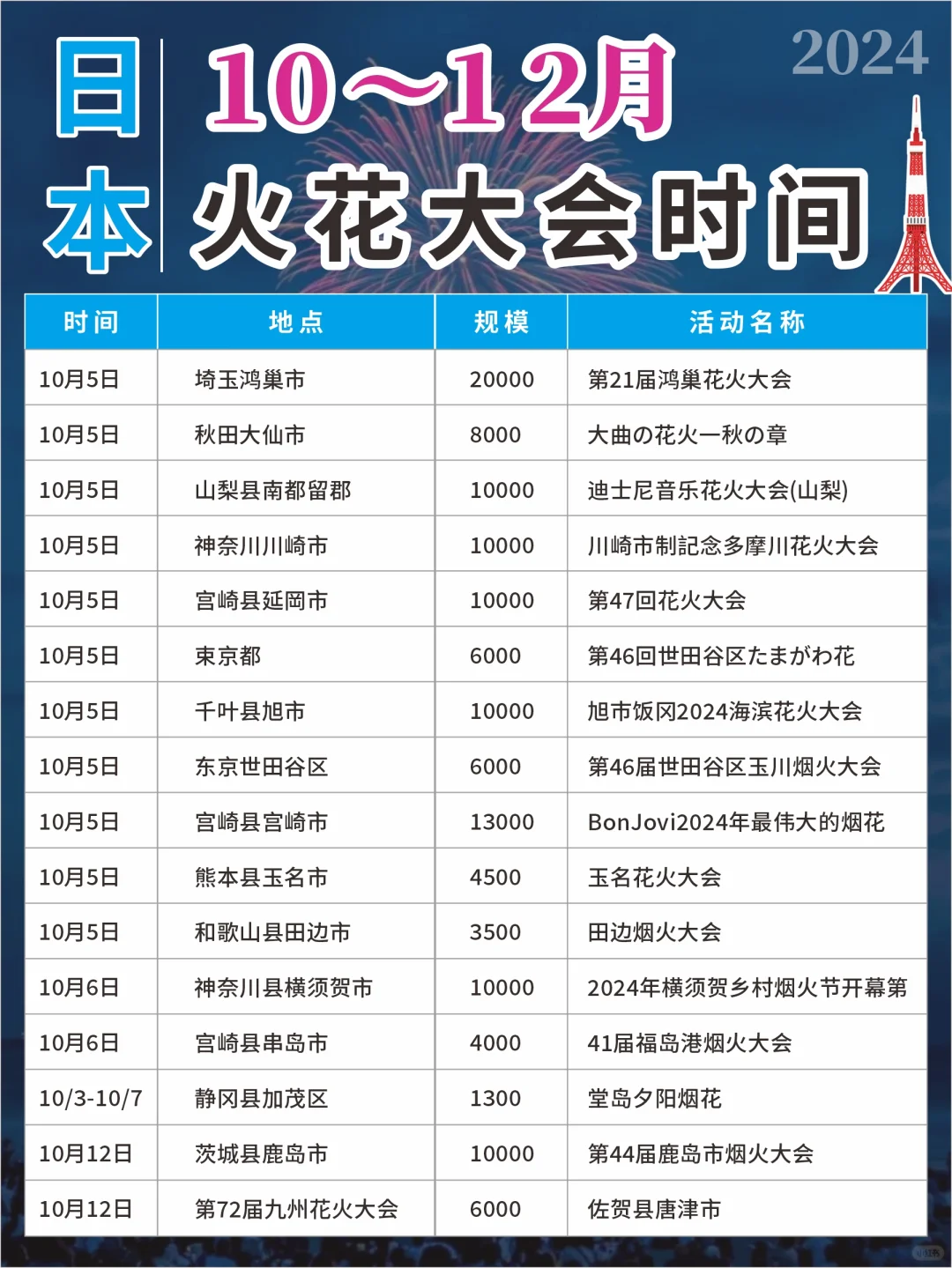 10~12月全日本🇯🇵的花火大会信息出炉啦!大型花火大会相对暑假会更多一些,但是并不是每个人的假期都赶在暑假,而且不同的季节有不同的特色,计划10-12月出行的😎小伙伴,如果刚好在自己行程安排的附近不妨去看一场绚丽的烟花🎆吧!小编整理了一些实用信息希望能帮到各位宝子