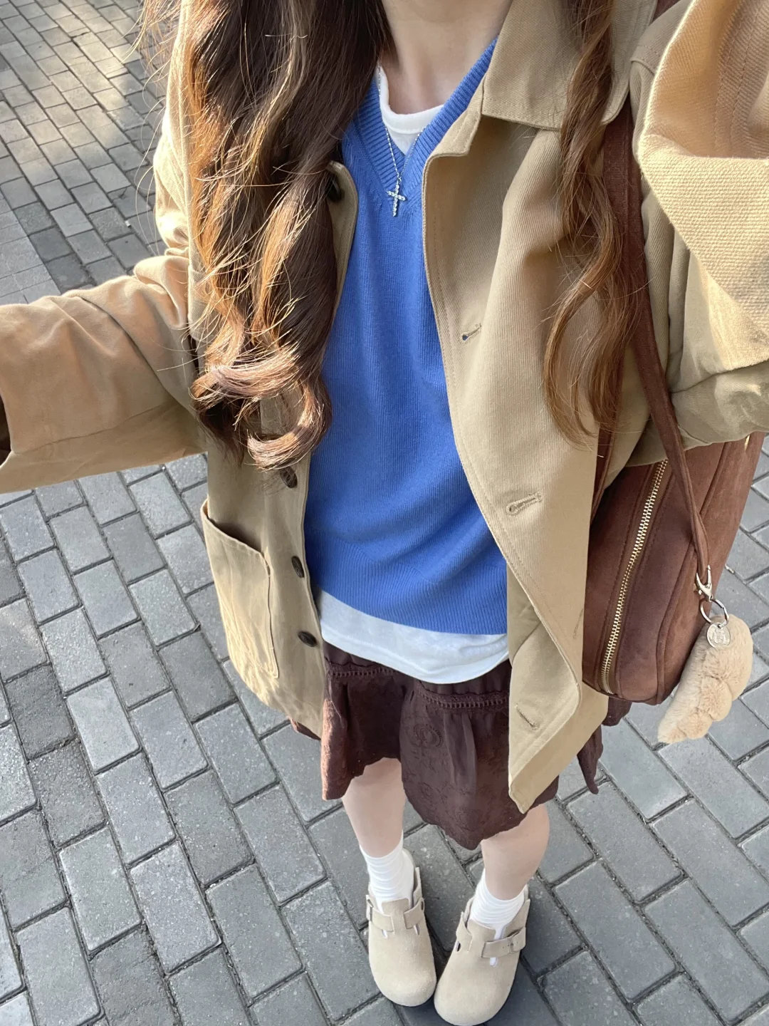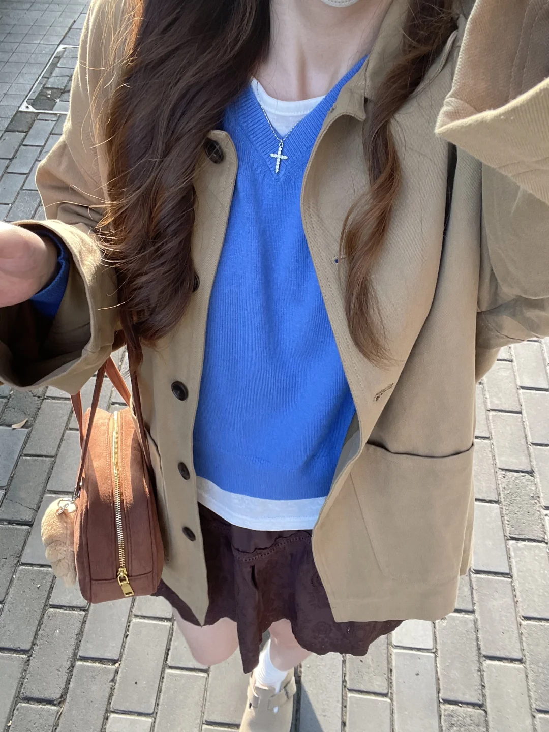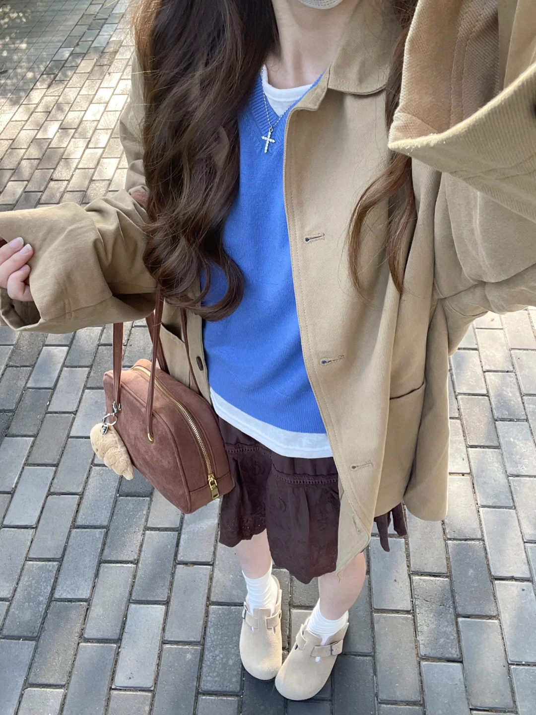 卡其色夹克➕克莱因蓝毛衣 韩系又复古~!