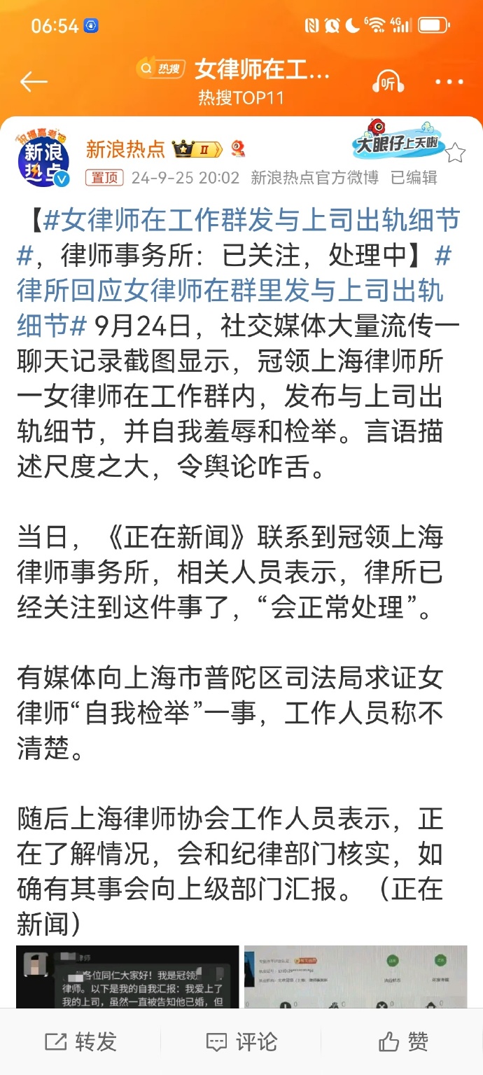 【女律师在工作群发与上司出轨细节】这个女律师主动勾引已婚男上司,甘愿当“小三”半年时间还显得如此理直气壮,真是寡廉鲜耻。在工作群里发与上司出轨细节,而且写得那么露骨,少儿不宜,还自称“官宣与上司的爱情”,目的很明确了,这是要逼上司与原配离婚,改与她结婚啊,这是图穷匕见了。