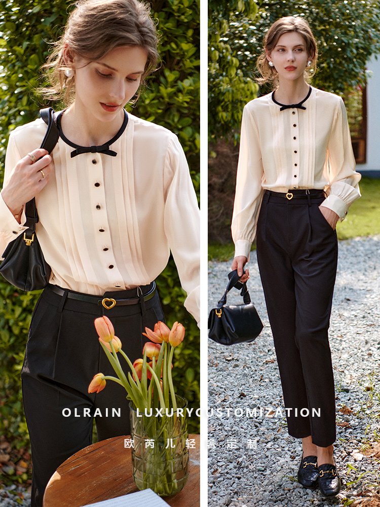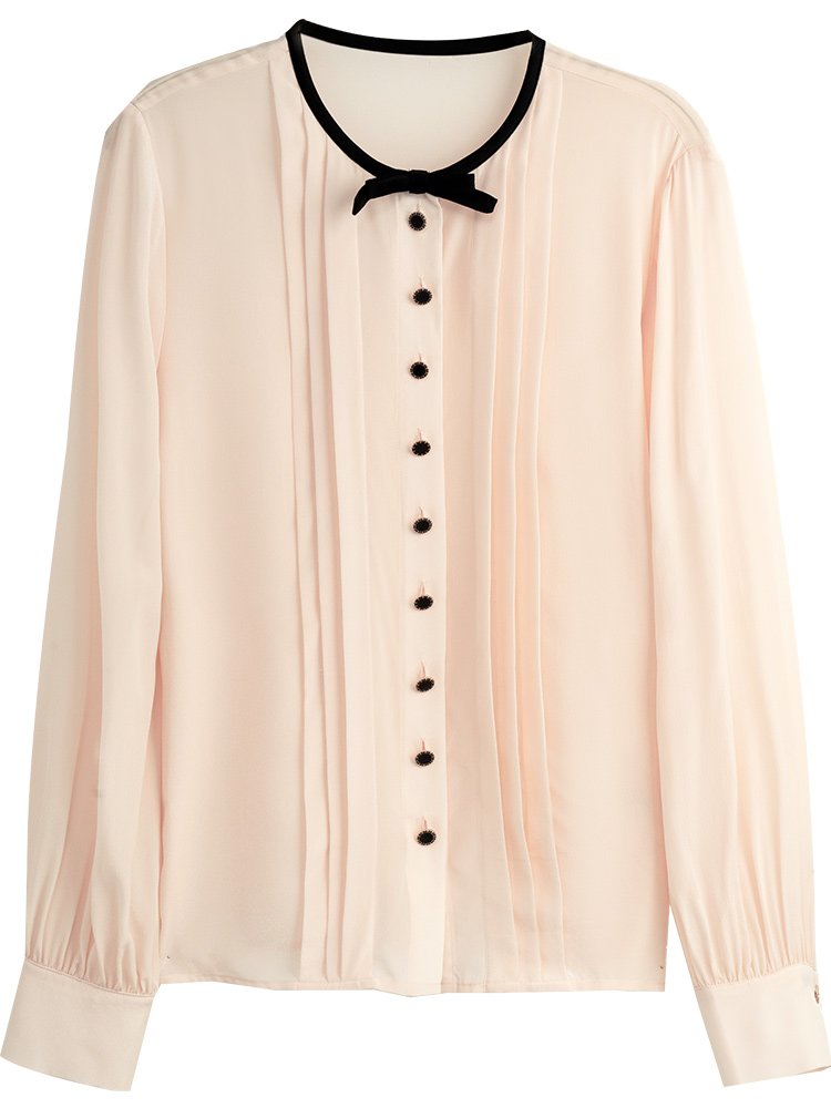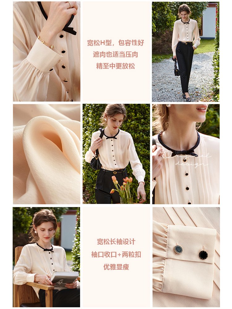 雪纺面料I亲肤舒适透气I垂坠轻盈,圆领撞色蝴蝶结设计,年轻时尚显精至