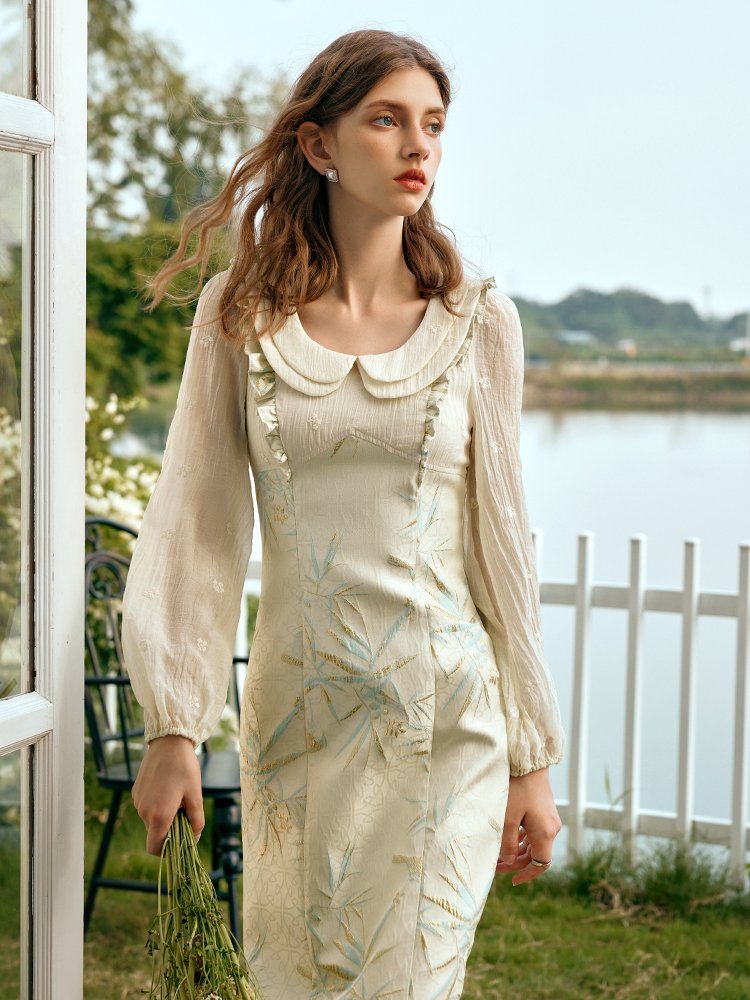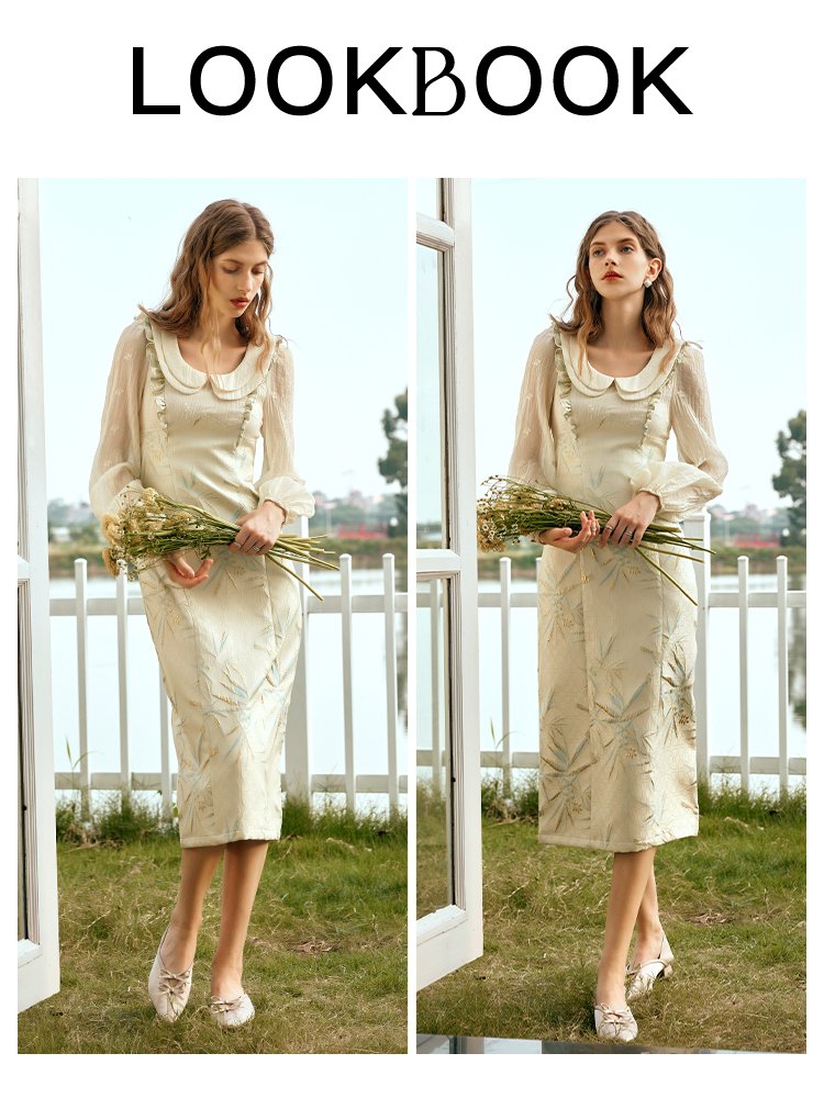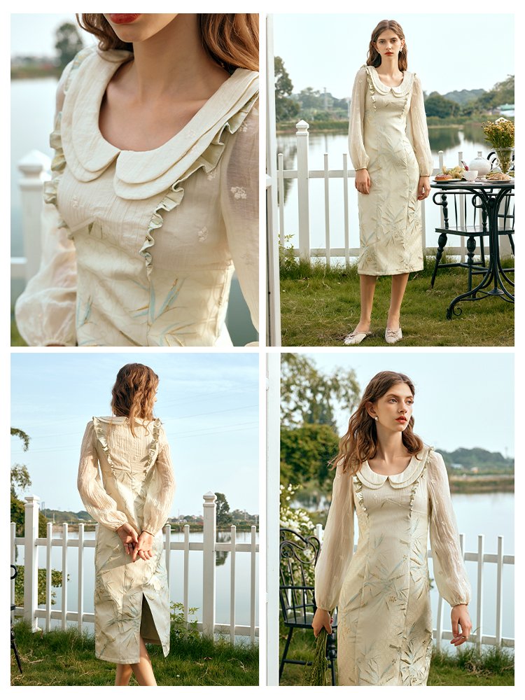定制提花时装面料,亲肤透氣舒适;竹子提花丰富肌理感,意境深远、款式獨到;改良旗袍式精心剪裁,身材曲线玲珑凸显;减龄双层娃娃领,微泡泡袖设计修饰手臂线条;胸位线分割自然更显立体,拉升腰线显高瘦;前幅两侧拼接木耳边装饰,下摆开叉行走自如