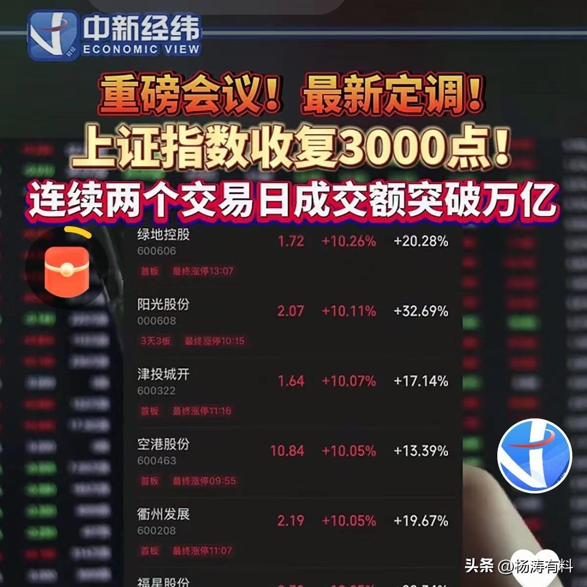 A股嗨了,房地产嗨了,早这样该多好! 就像去商K消费,1000元、1000元的往外掏,即便掏10次,也会让人感觉底气不足。 不如直接掏出1万元甩在桌子上,同时拍一拍阿玛尼的皮包,说今晚必须尽兴,气氛立马就沸腾了。A股大涨 沪指收复3000点