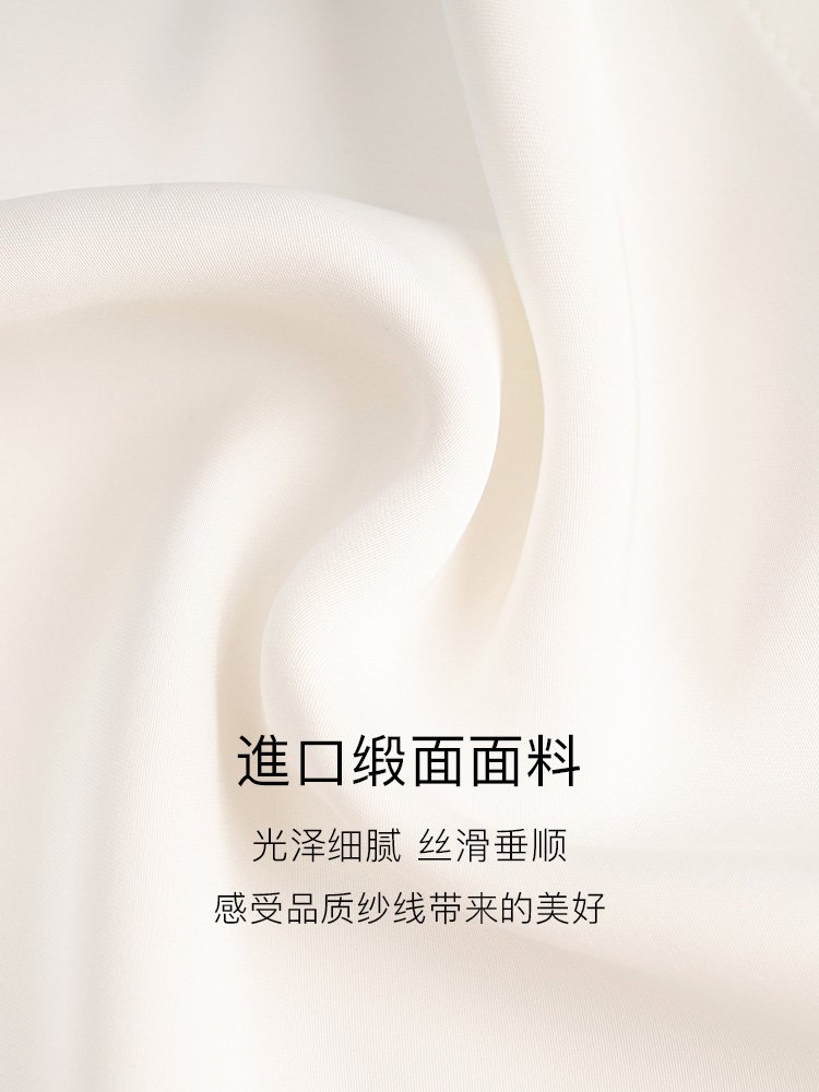 选用進口缎面面料,手感细腻顺滑;透气舒适,光泽感很篙级,垂坠感好;刺绣双层娃娃领,刺绣工艺精至;甜美减龄有层次感,精至美观,显脸小;领口处盘扣流苏点缀小珍珠,精美雅致;不会过于夸张又能彰显日常造型感;门襟内有暗扣设计,简洁美观,穿脱方便;袖口宽幅袖克夫+简洁两粒扣,优雅有腔调感