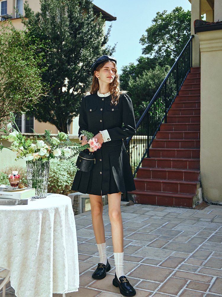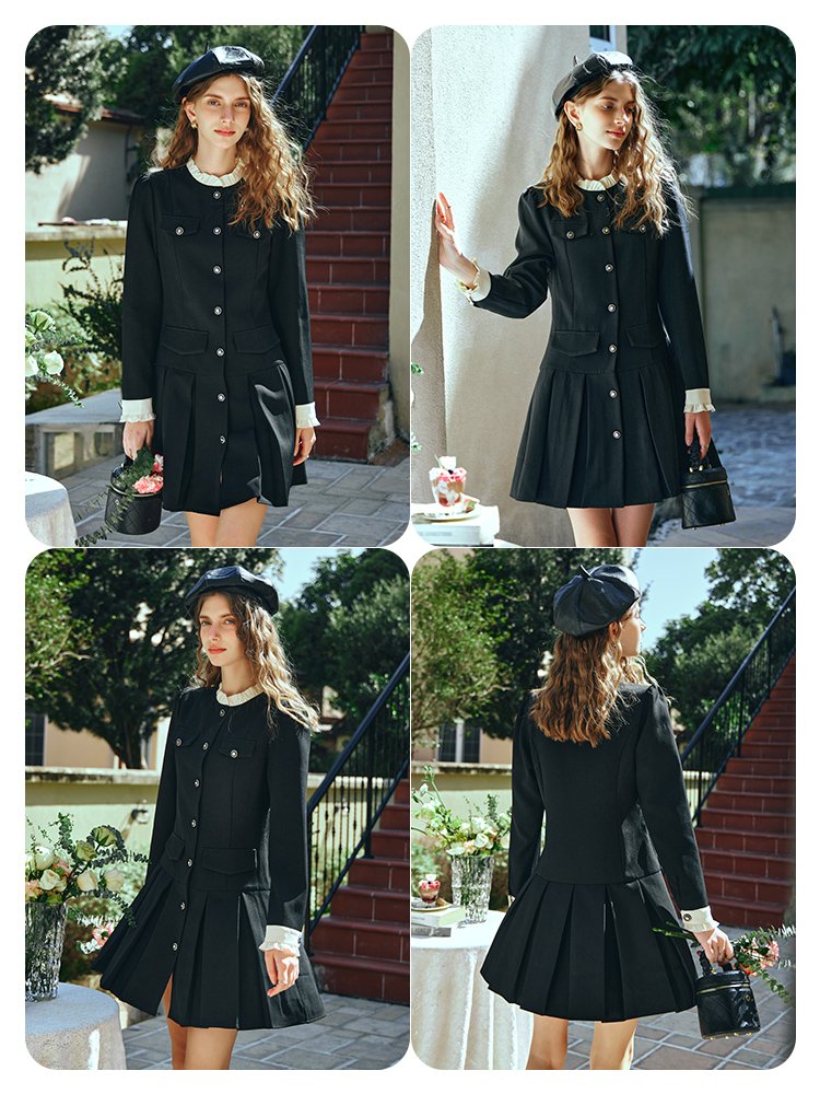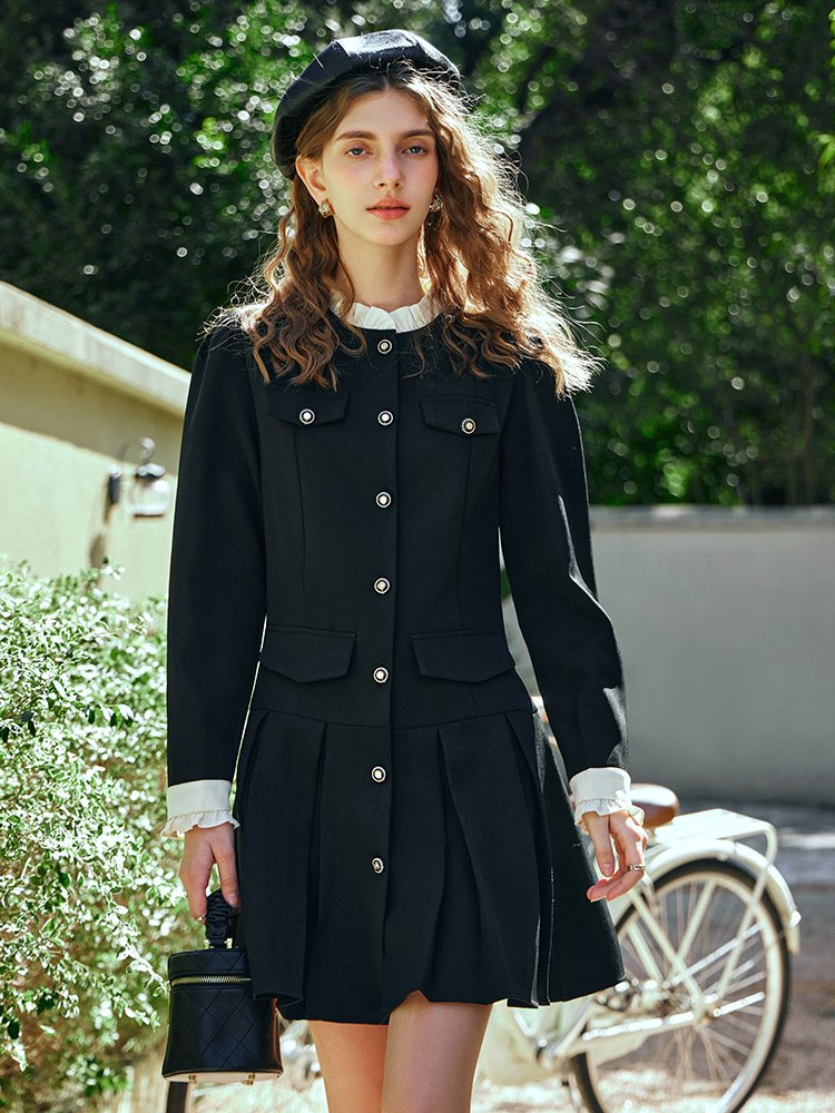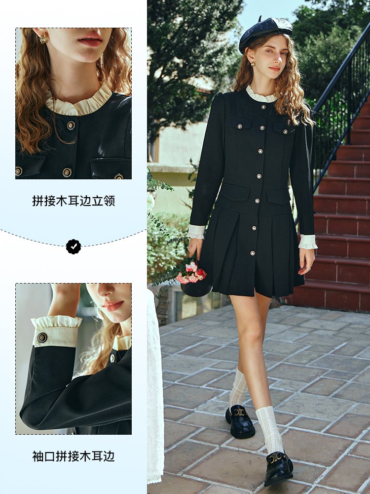 立领木耳边撞色设计,甜美俏皮,与袖口相呼应;门襟定制复古浮雕手缝扣点缀,方便好穿脱;前幅上下两侧做对称袋盖,丰富层次感;高腰压褶裙摆,娇俏灵动,修饰臀胯大腿肉肉