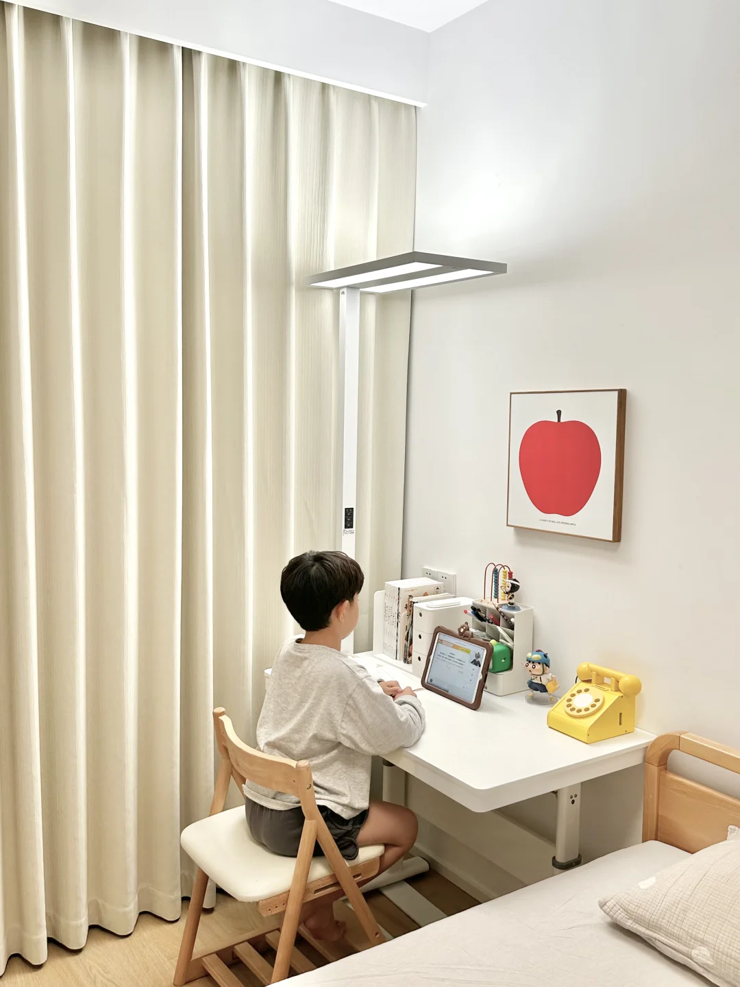 儿子一年级结束了,前一阵带他去检查眼睛竟然近视了,有50度💔,大夫说除了电子产品,学习姿势要调整以外,卧室的光源也不能糊弄,就是该注意的地方都要注意到🌿