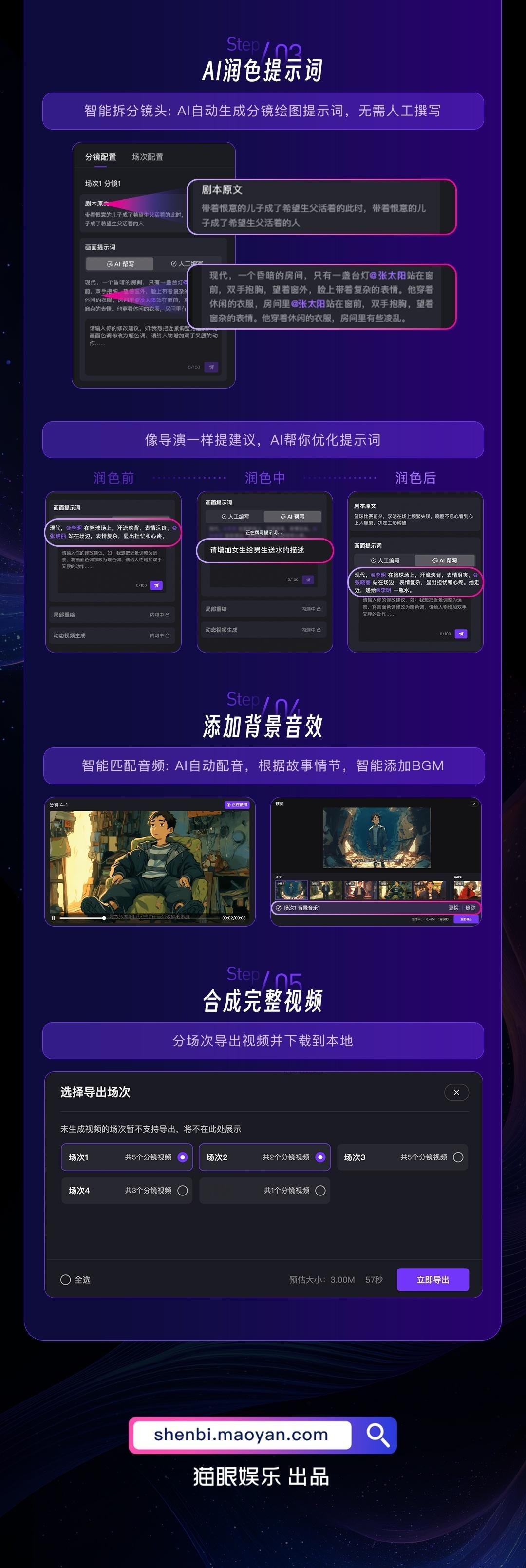 可根据用户上传的剧本,进行一键智能分析、智能角色创作、智能分镜创作、智能台词朗读,实现剧本内容的视听化呈现。