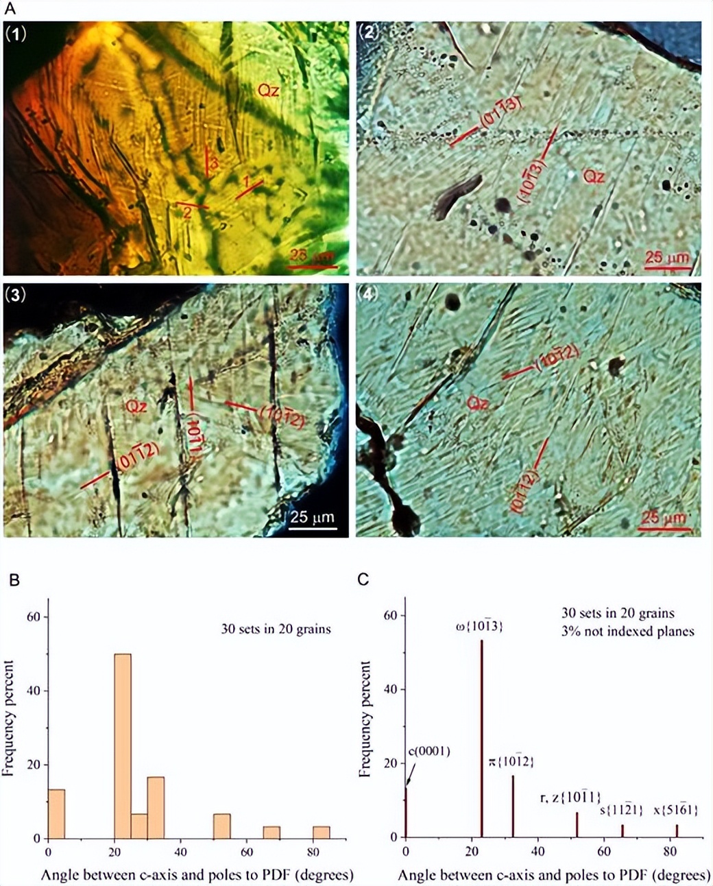 证据来自该区域岩石的微观结构,科学家在其中发现了一种特殊的微观结构——“石英击变面状页理”(Planar Deformation Features, 简称PDFs)。