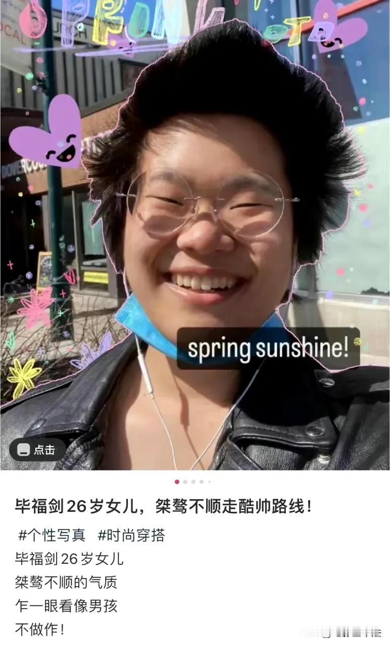 毕福剑女儿,引起热议! 9月28日,毕福剑女儿毕凌在海外留学的一组生活照,在网络开始流传,瞬间引起议论纷纷,她们这种说: 看她这一身打扮,一定能在国外混的风生水起。 毕姥爷的LBGT闺女,毕姥爷有福了。 我还以为是岳云鹏呢。 唐氏? 毕姥爷家后继有人。 比凤姐还吓人。 确定不是儿子。 长的真够艺术的。 抱歉,表示尊重但是真心欣赏不来。 …… 怎么打扮是个人自由,即使有些人非常特立独行,我们也应该保持基本的尊重,毕竟就算是自甘堕落也是她们的自由,别人无权阻止,况且“甲之砒霜,乙之蜜糖”,毕福剑女儿肯定觉得自己是精神升华了。