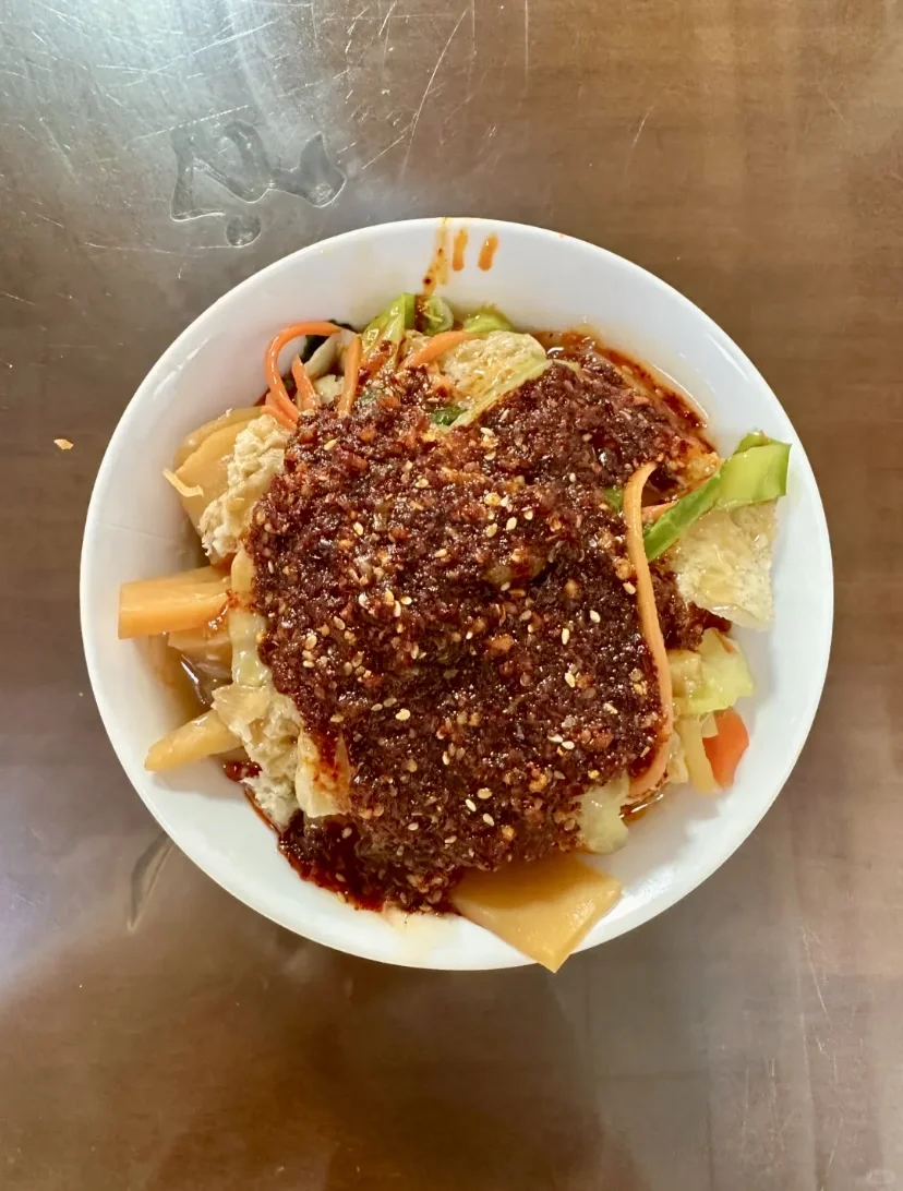 西北麻辣烫辣子看着红但不辣很香啊。吃面吃多了,还是得麻辣烫补充点蔬菜。主食还可有当地的粉或麻花。