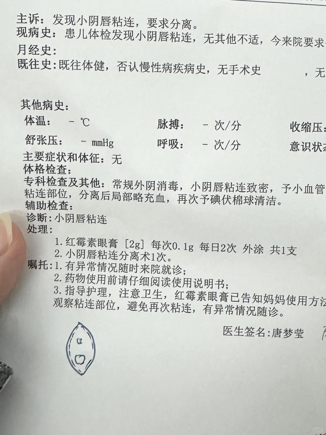 治疗过程非常迅速,医生直接告诉我应该是什么样的,宝宝现在的状况属于完全粘连,涂药不一定有用。直接拿了一个剪子轻轻一挑就完全打开了,我还没反应过来就结束了。宝宝一个暴哭😭不过很快就安抚好了,只有轻微的出血🩸