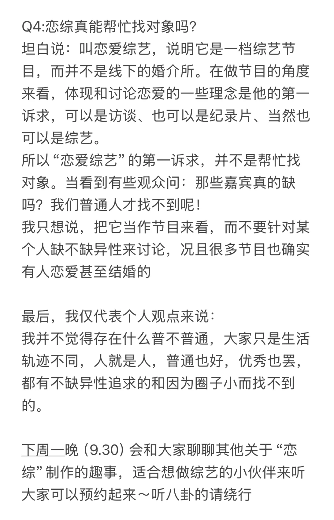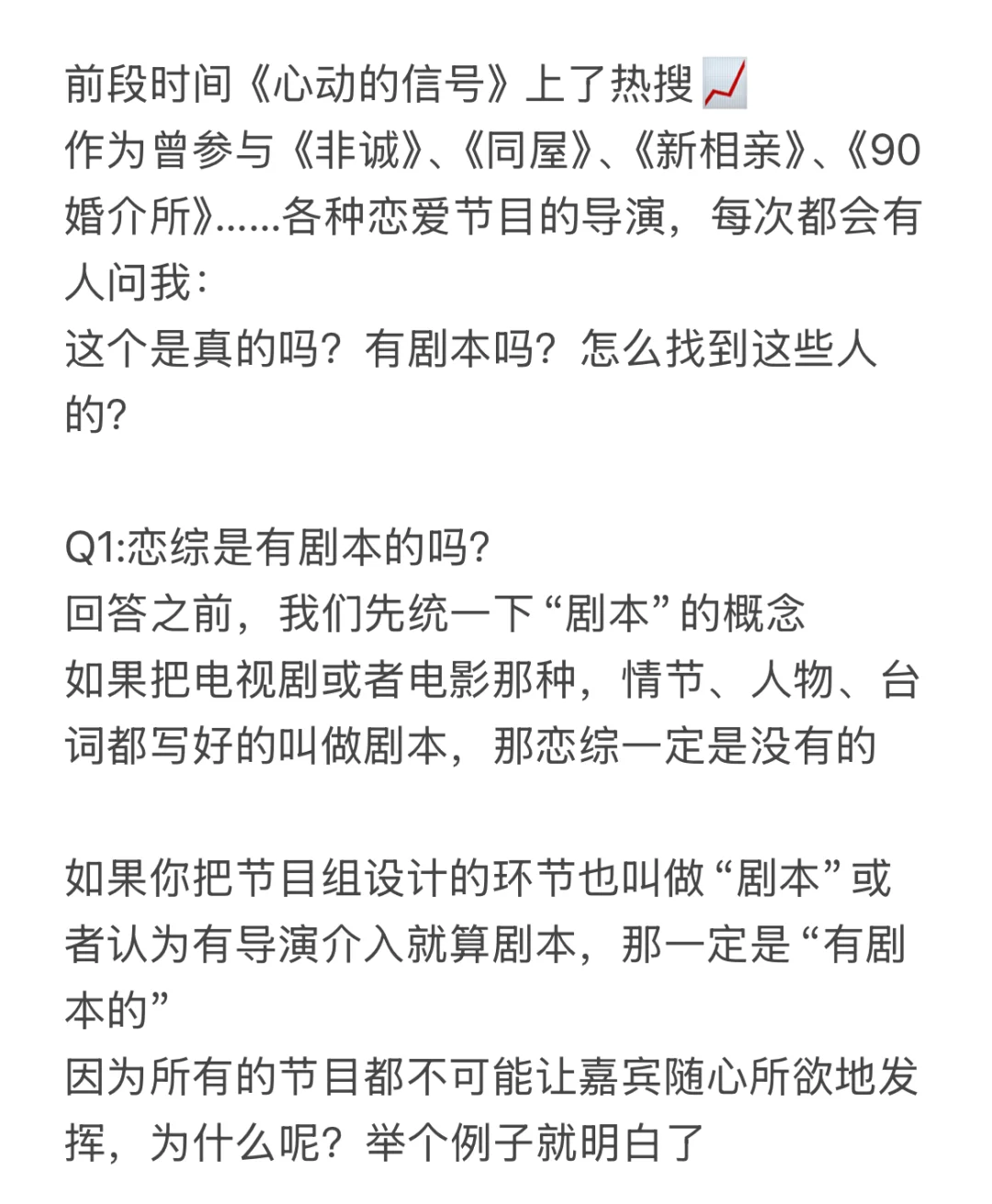 前段时间《心动的信号》上了热搜📈 作为曾参与《非诚》、《同屋》、《90婚介所》……各种恋爱节目的导演,每次都会有人问我: 这个是真的吗?有剧本吗?怎么找到这些人的? Q1:恋综是有剧本的吗? Q2:这些嘉宾是怎么选出来的? Q3:为啥选的嘉宾都不“普通” Q4:恋综真能帮忙找对象吗? 👈下周一晚(9.30)会和大家聊聊其他关于“恋综”制作的趣事,适合想做综艺的小伙伴来听大家可以预约起来~听八卦麻烦请绕行