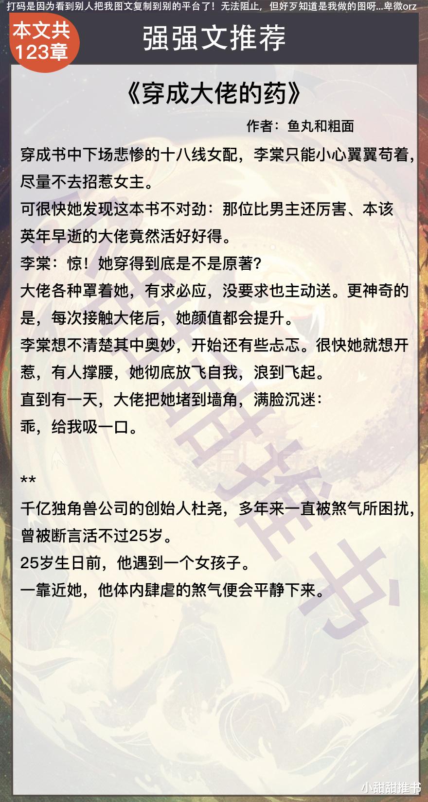 大家好,这期给大家推荐的是6本男强女强甜文小说!穿书文!女配文!第一本《穿成大佬的药》作者:鱼丸和粗面一句话简介:大佬就
