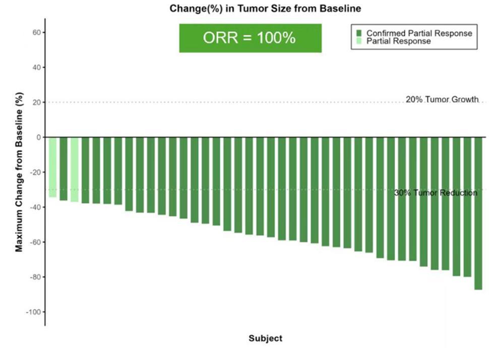 这意味着,所有接受这一方案治疗的患者,肿瘤都实现了高效的退缩,治疗后的肿瘤最大径退缩到基线的70%以下。