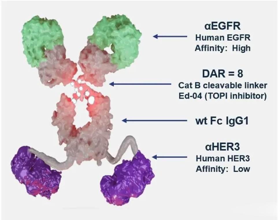 以往的抗体偶联药物通常设计为结合单个位点,而这种新型药物则设计为可以同时结合两个位点:一种是EGFR,另一种是HER3。