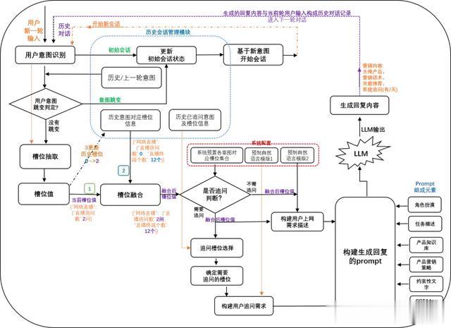在多轮对话的过程中,系统会从用户输入的内容中确定意图并抽取对应的槽位值,槽位值融合历史槽位后通过模版拼接成一段描述用户上网需求的自然语言。可根据不同意图场景有针对性的设计模版,并在模版中有针对性的引导大模型按照我们期望的方向来生成回复。