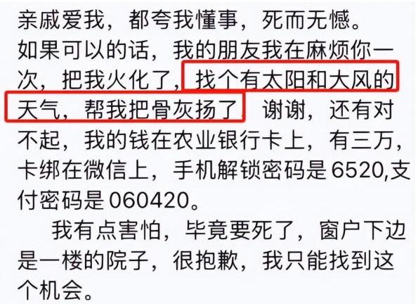 魏某在遗言中特意表达了对一楼住户的歉意,并明确表示不愿给家人留下骨灰念想。她请求朋友“在有太阳和大风的日子”把骨灰撒掉。
