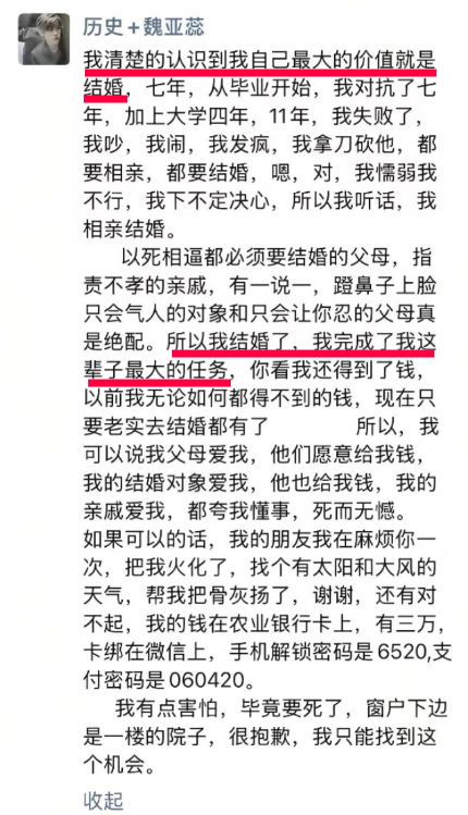 朋友圈的遗书里,她详述了被催婚七年的抗争与失败。