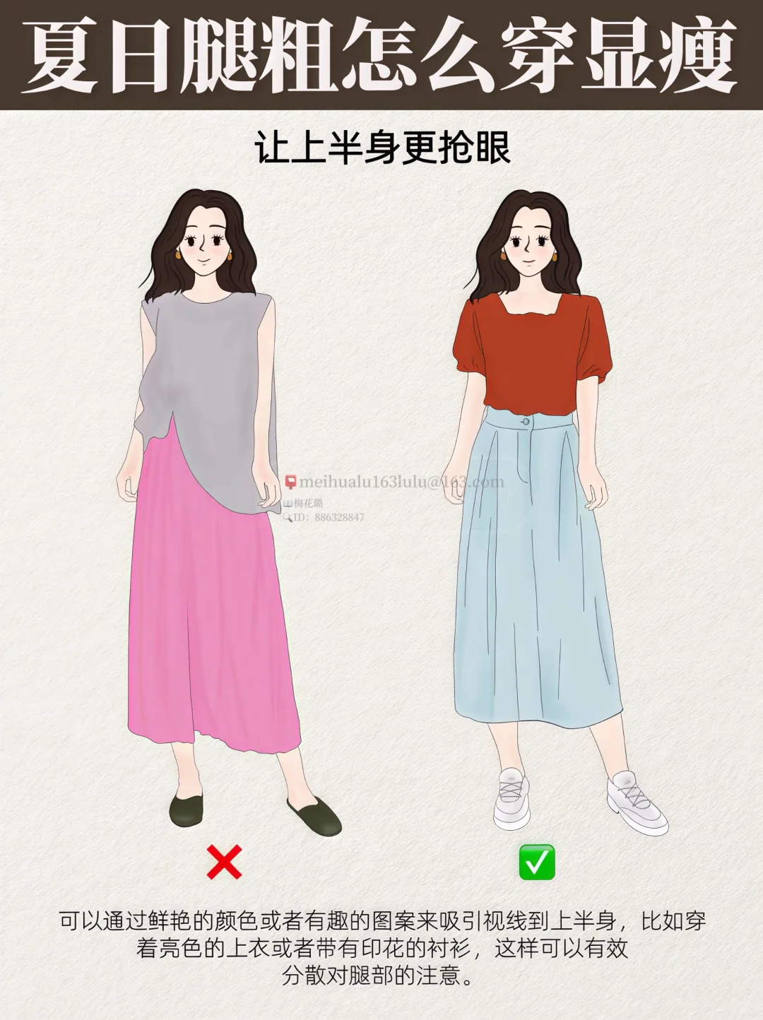3️⃣. 让半身更抢眼:可以通过鲜艳的颜色或者有趣的图案来吸引视线到上半身,比如穿着亮色的上衣或者带有印花的衬衫,这样可以有效分散对腿部的注意。