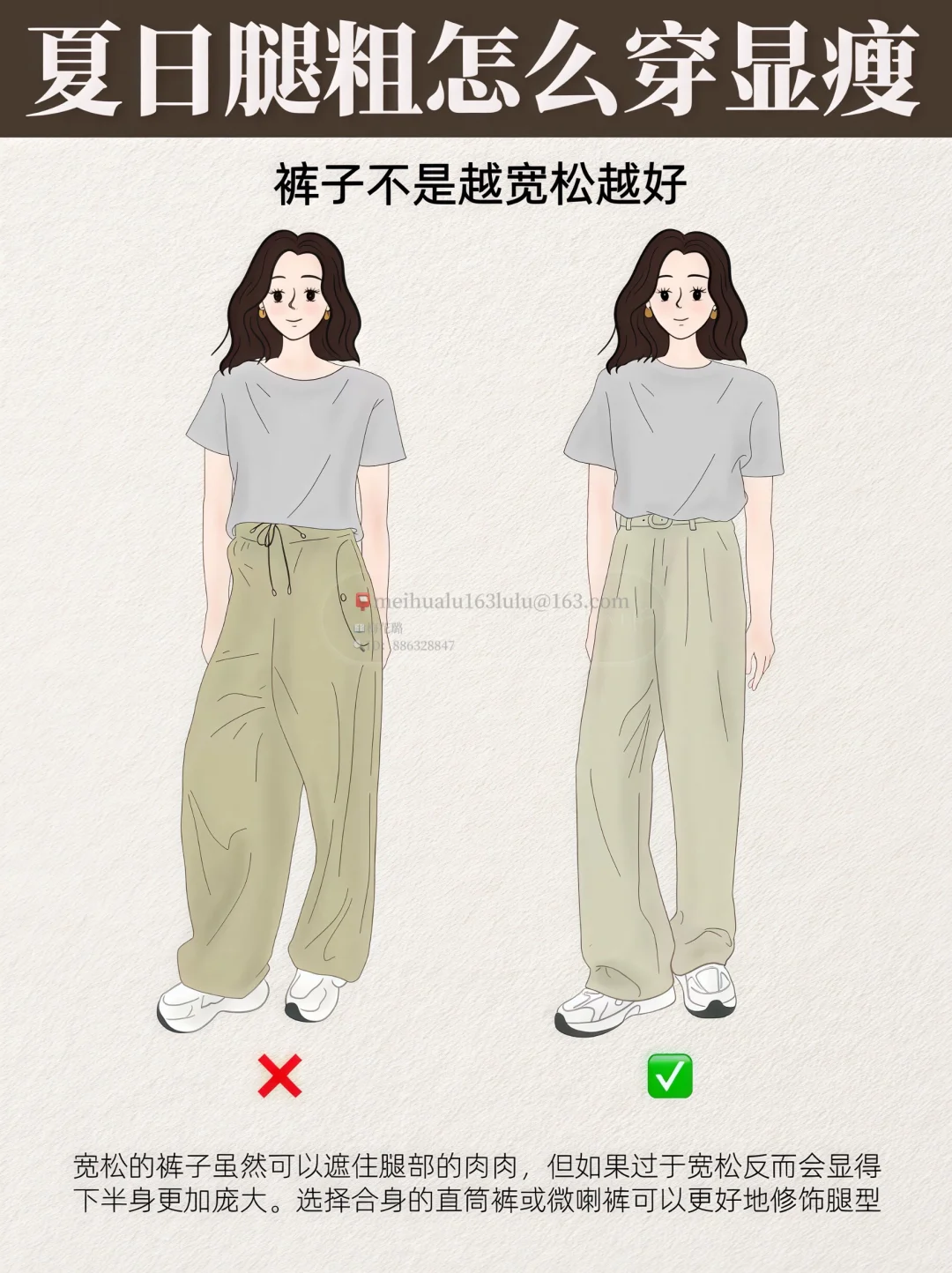 2️⃣. 裤子不是越宽松越好:宽松的裤子虽然可以遮住腿部的肉肉,但如果过于宽松反而会显得下半身更加庞大。选择合身的直筒裤或微喇裤可以更好地修饰腿型。