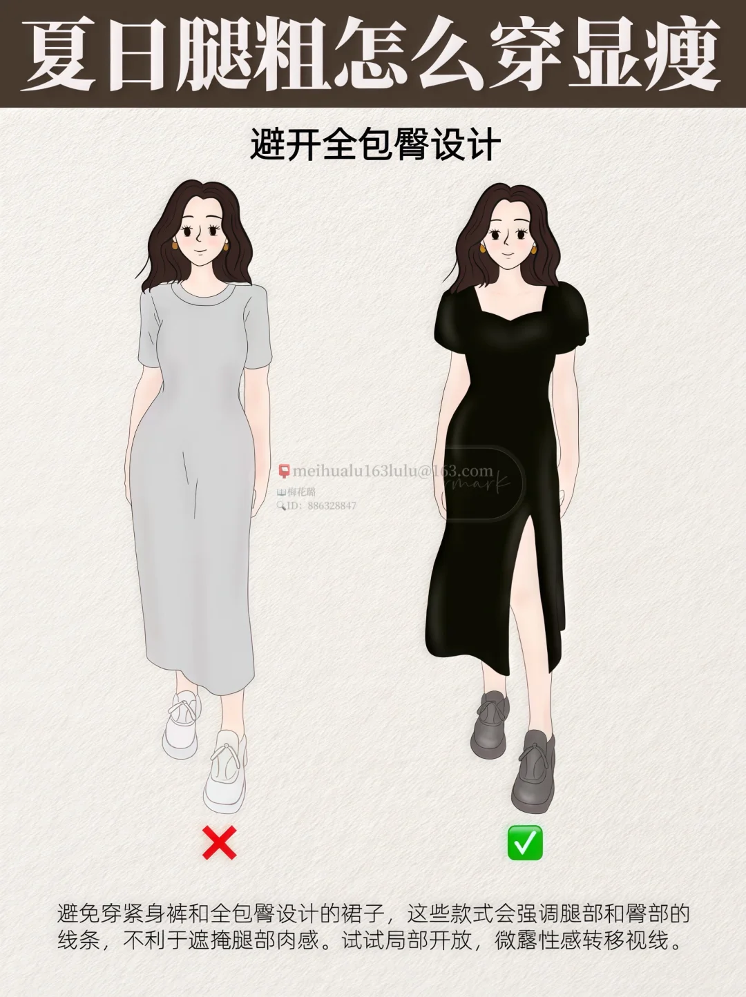 1️⃣. 避开全包臀设计:避免穿紧身裤和全包臀设计的裙子,这些款式会强调腿部和臀部的线条,不利于遮掩腿部肉感。试试局部开放,微露性感转移视线。