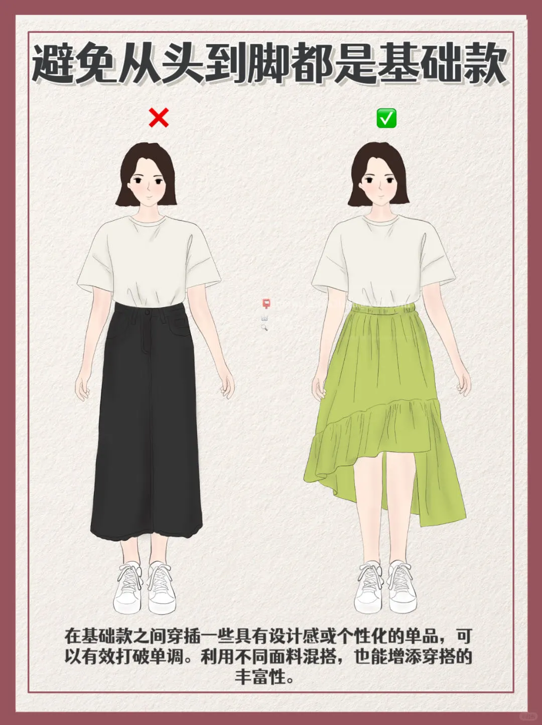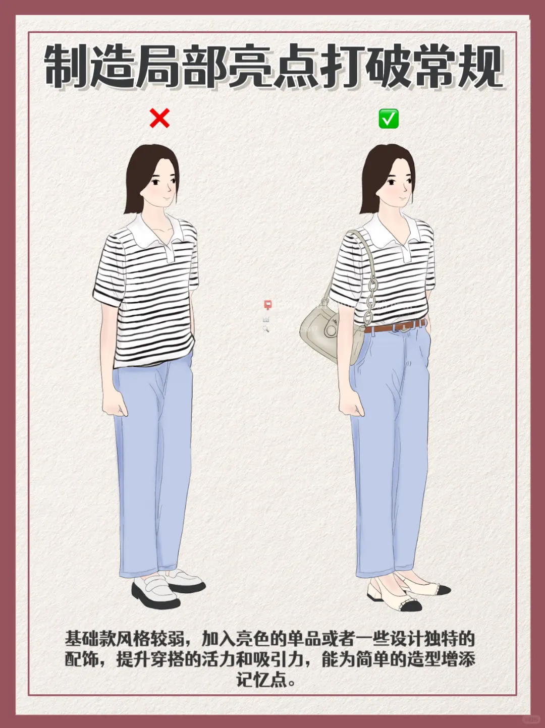 💎基础款风格较弱,加入亮色的单品或者一些设计独特的配饰,提升穿搭的活力和吸引力,能为简单的造型增添记忆点。