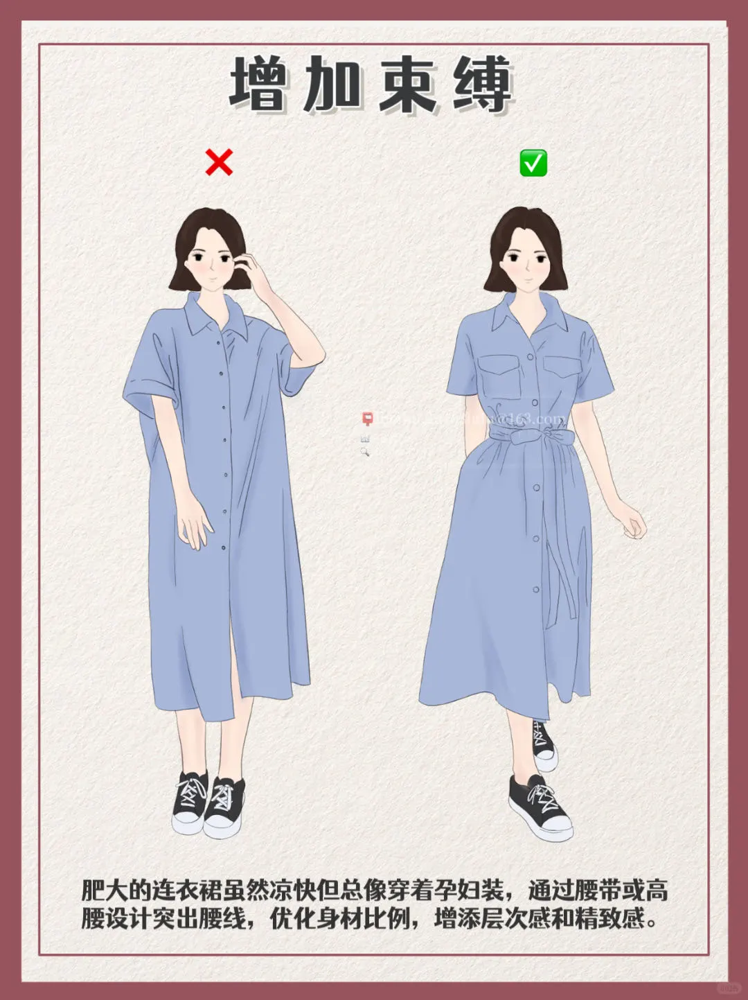 👕肥大的连衣裙虽然凉快但总像穿着孕妇装,通过腰带或高腰设计突出腰线,优化身材比例,增添层次感和精致感。