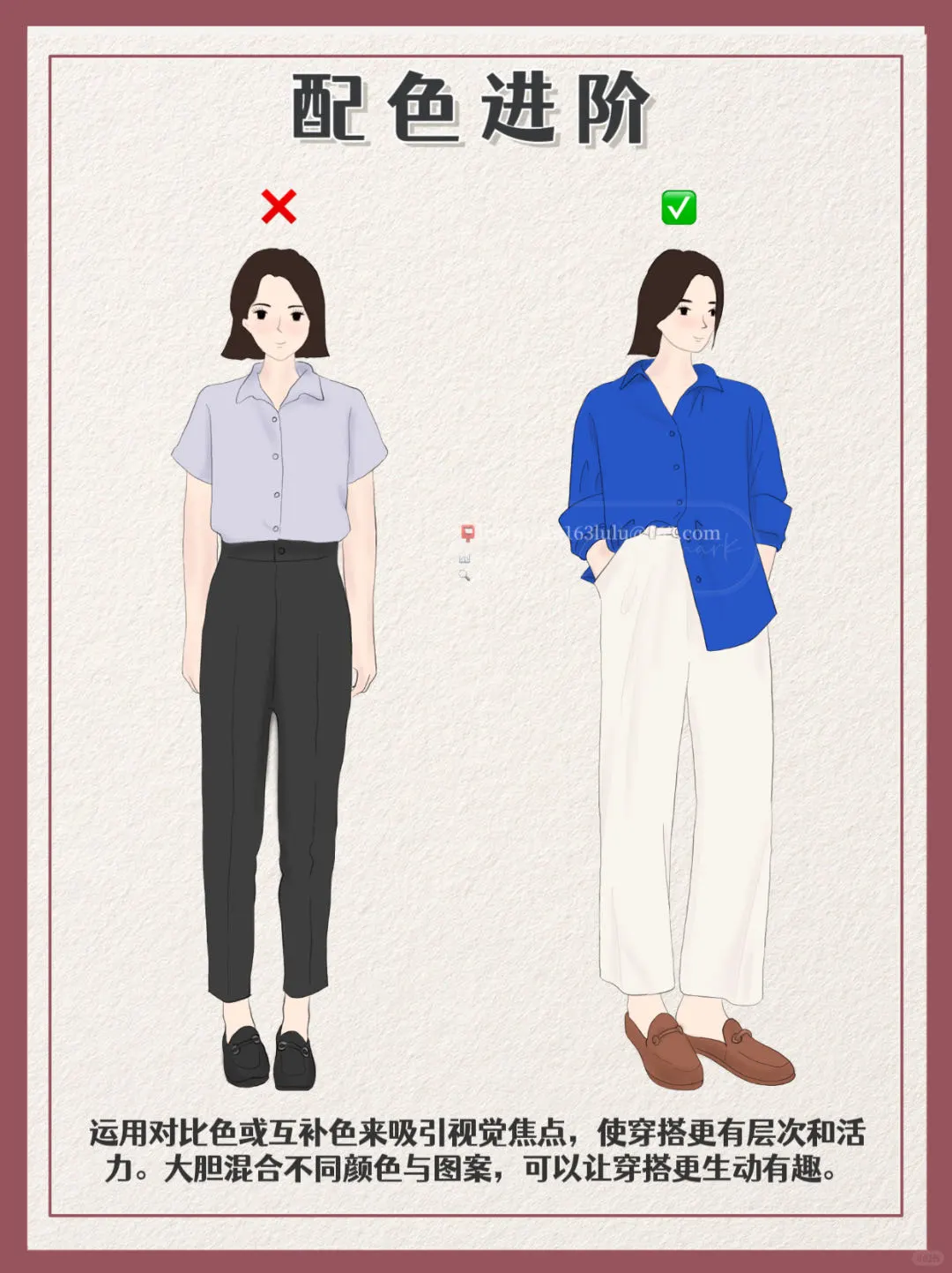🎒运用对比色或互补色来吸引视觉焦点,使穿搭更有层次和活力。大胆混合不同颜色与图案,可以让穿搭更生动有趣。