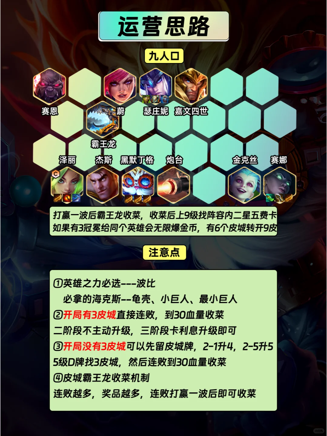 🔥【运营思路】 3⃣开局有3皮城不升级直接开始连败,正常站位如左图,如果碰到连败的皮城同行如右图把蔚卡在角落站位 4⃣2-3自动升4级,根据阵容补人口凑羁绊,外面有同行或者对手质量较低就只上3皮城,大选优先抢泽丽装备 5⃣2-7/3-2升5级,2-7打野怪记得上质量防止打不过野怪,如果前期没有3皮城的话可以在2-5升5级D牌找3皮城 6⃣后续卡50利息升6级,注意外面的质量,继续皮城连败 7⃣后续继续卡利息升7级,继续连败,留体系内的英雄即可 8⃣连败到血量在30左右,需要升8级大D找二星泽丽和瑟庄妮提升质量收菜,赛娜没来先用小炮,黑默丁格没来先用艾克 9⃣打赢一波后霸王龙收菜,收菜后上9级找阵容内二星五费卡 🆘满层80层霸王龙收菜如果有3冠冕给同个英雄会爆金币,有6个皮城转开9皮城 💭升级的时间可以根据阵容和经济情况选择提前或者延后1-2回合 🔥【出装顺序】 🔸羊刀>巨杀>板甲>狂徒>红霸符 🎈前期优先做泽丽的装备,其次做前排肉装,后期多余的物理输出装给赛娜,多余肉装给嘉文四世,多余羊刀给黑默丁格,黑默丁格炮台带1点金1缩小1导弹