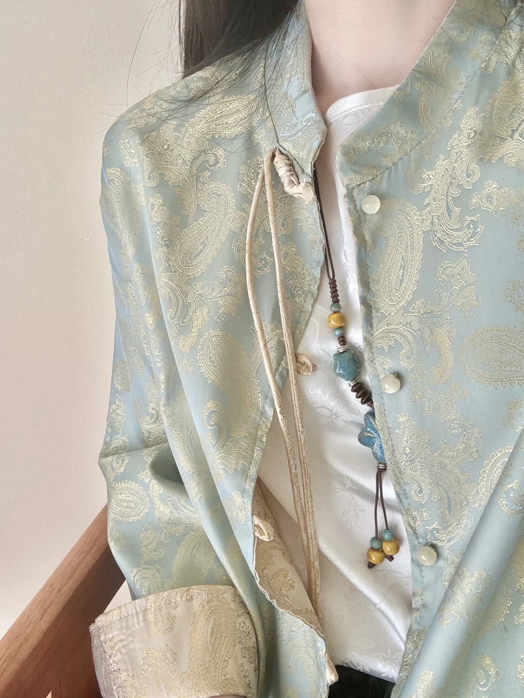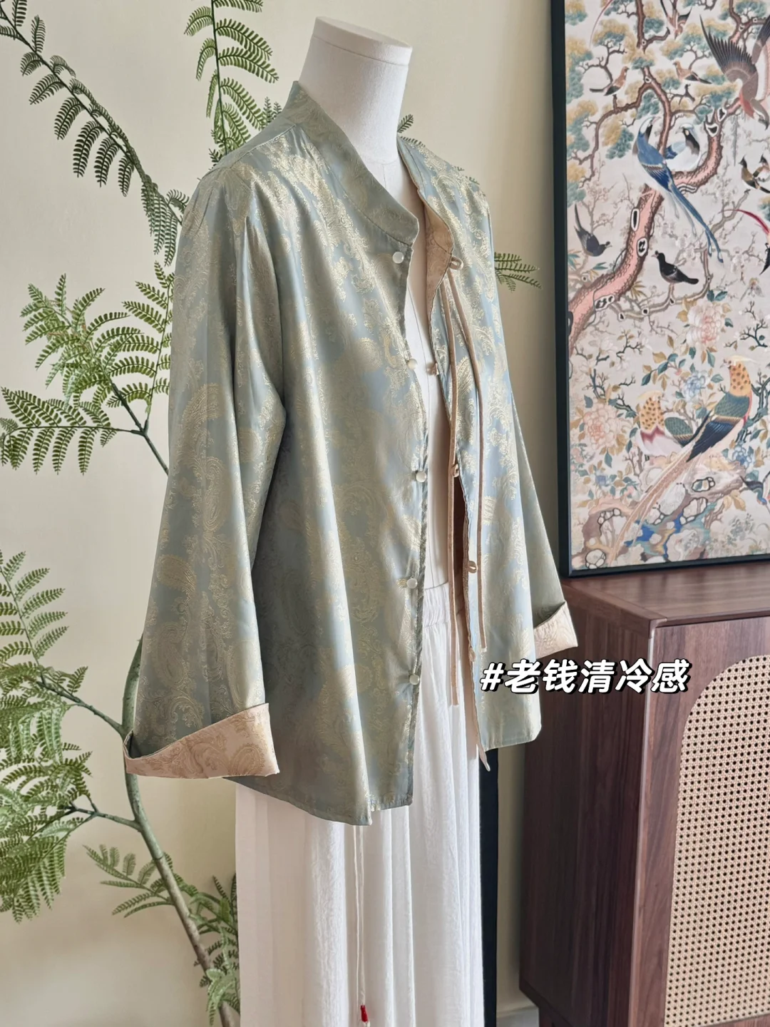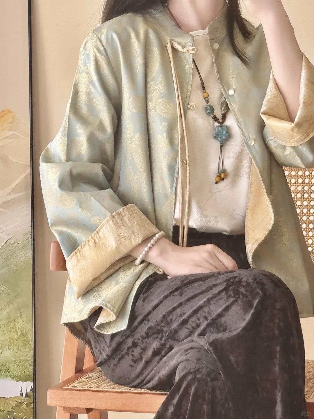 日常新中式 初秋穿搭 氛围感缎面盘扣外套 黑黄皮也可以驾驭的琉璃蓝绿配色 好好看!! 一件衣服 可做内搭可外穿Get住 天冷后作为内搭穿在大衣里 叠搭氛围 室内脱掉大衣不单调 轻巧又耐看[派对R] 搭配参考:【梦境】+【冬月雪花】