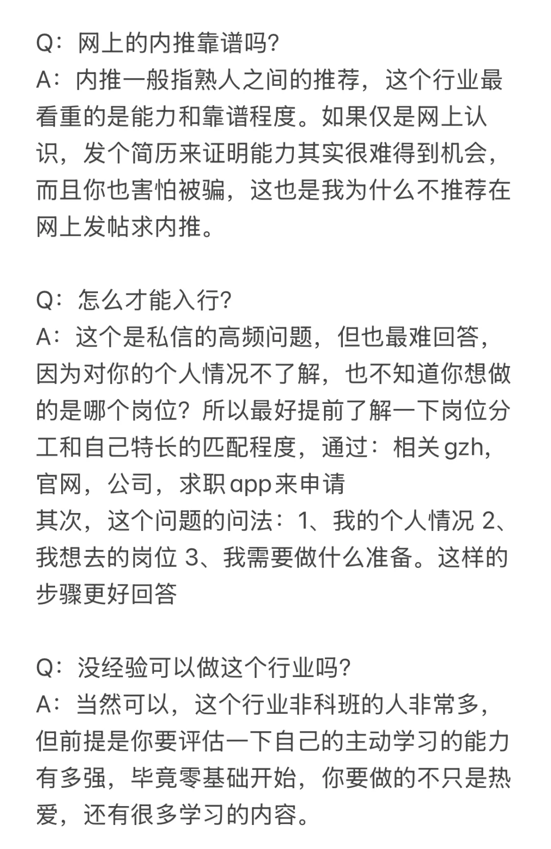 A:内推一般指熟人之间的推荐,这个行业最看重的是能力和靠谱程度。如果仅是网上认识,很难证明能力你也害怕被骗,这也是我为什么不推荐在网上发帖求内推