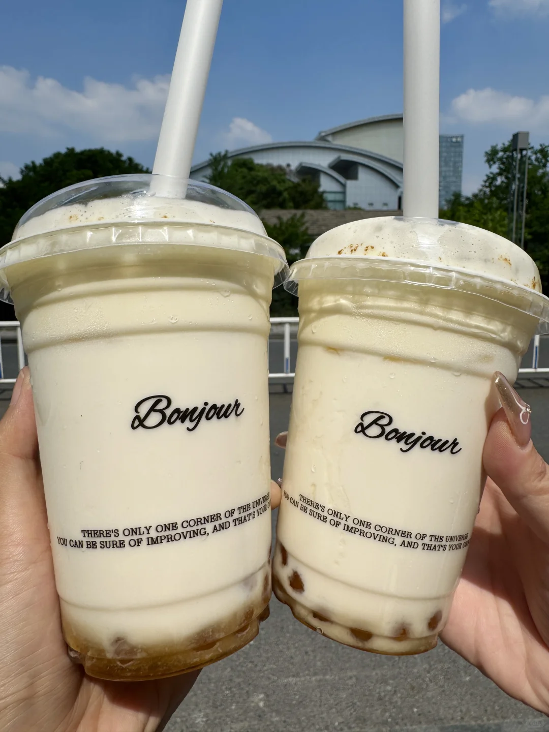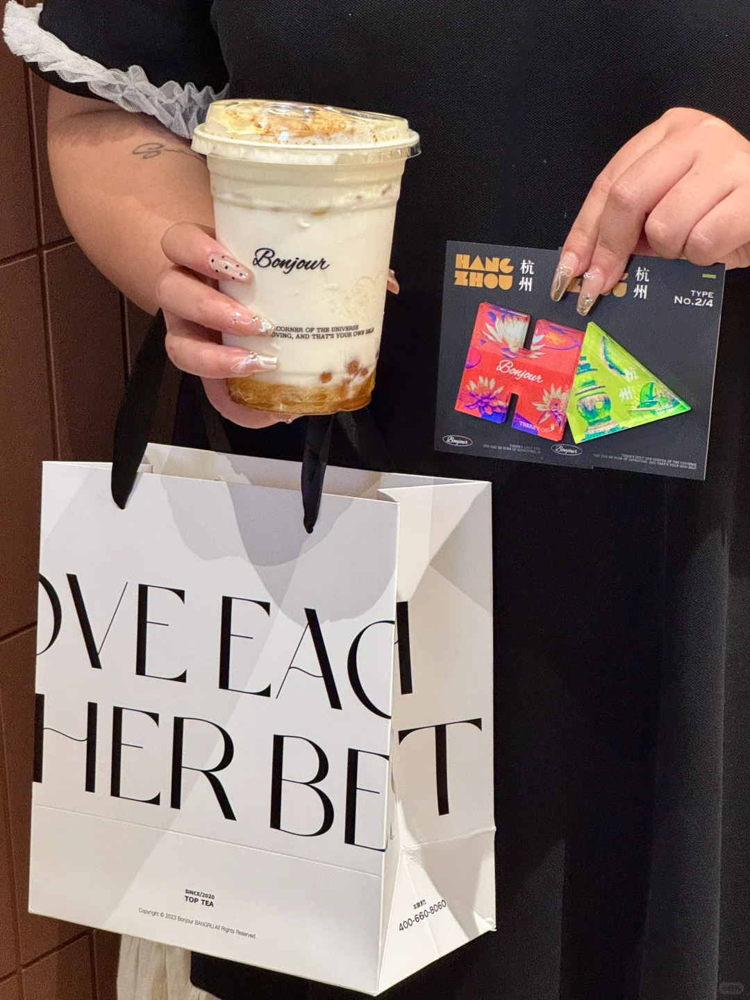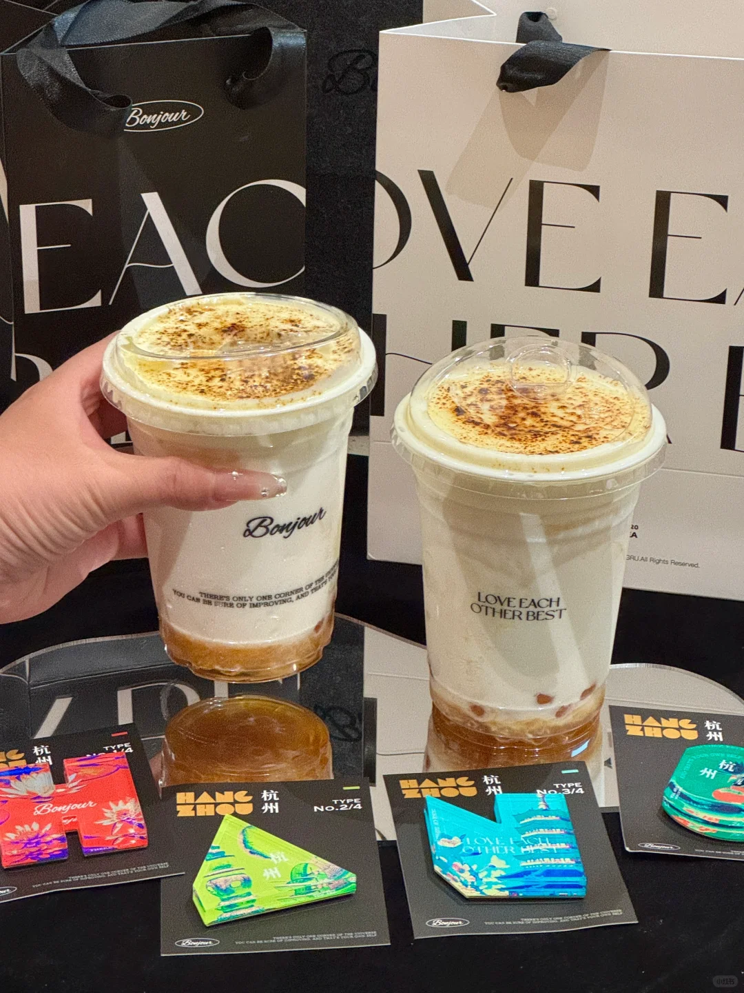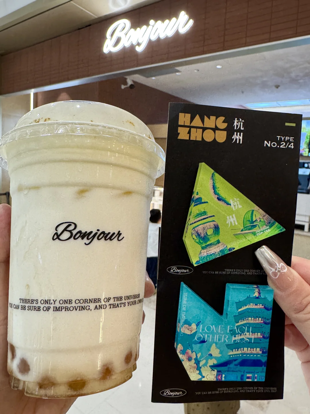 喝到了喝到了!开业第一天就冲了!点了招牌浮云鲜牛乳 11:31分拿到手的!11:40分就喝完了哈哈~鲜牛乳糯叽叽的珍珠尊嘟喝不厌 🥹还有好好看的杭州限定周边啊!每款都要得到!
