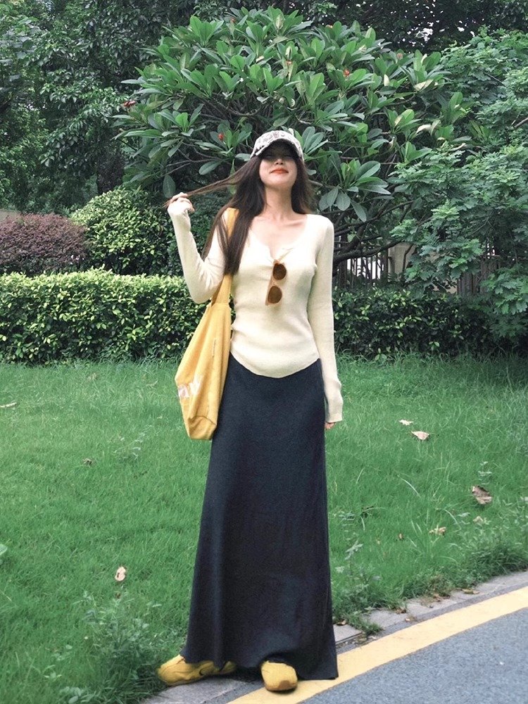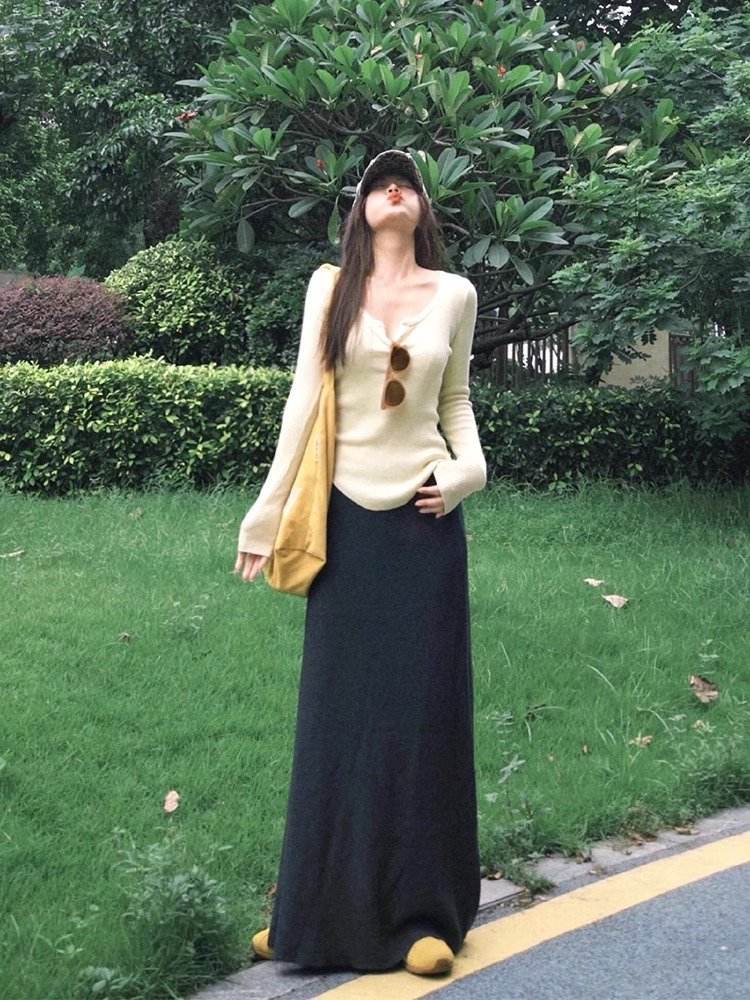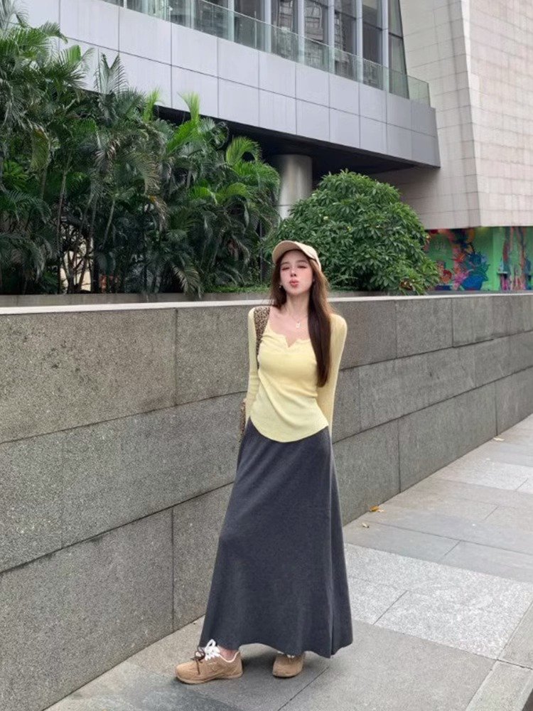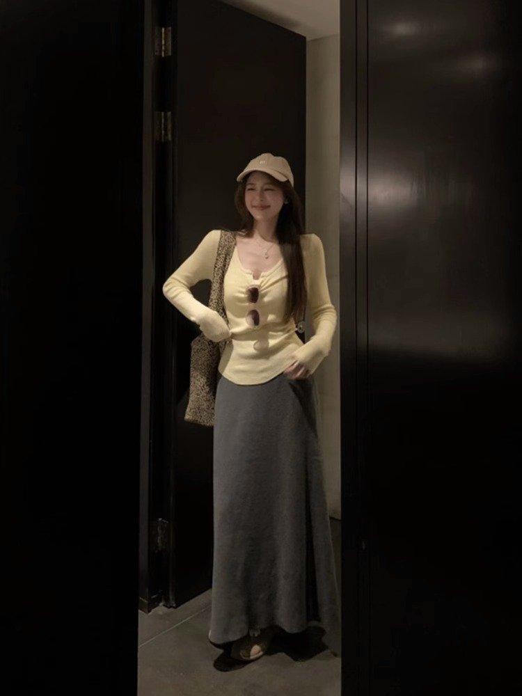 2024秋季新款法式黄色针织长袖搭配一整套半身连衣裙女小个子长裙