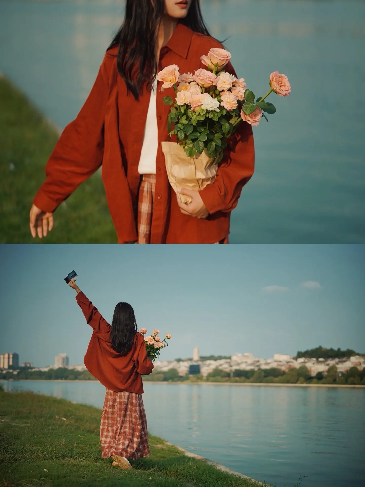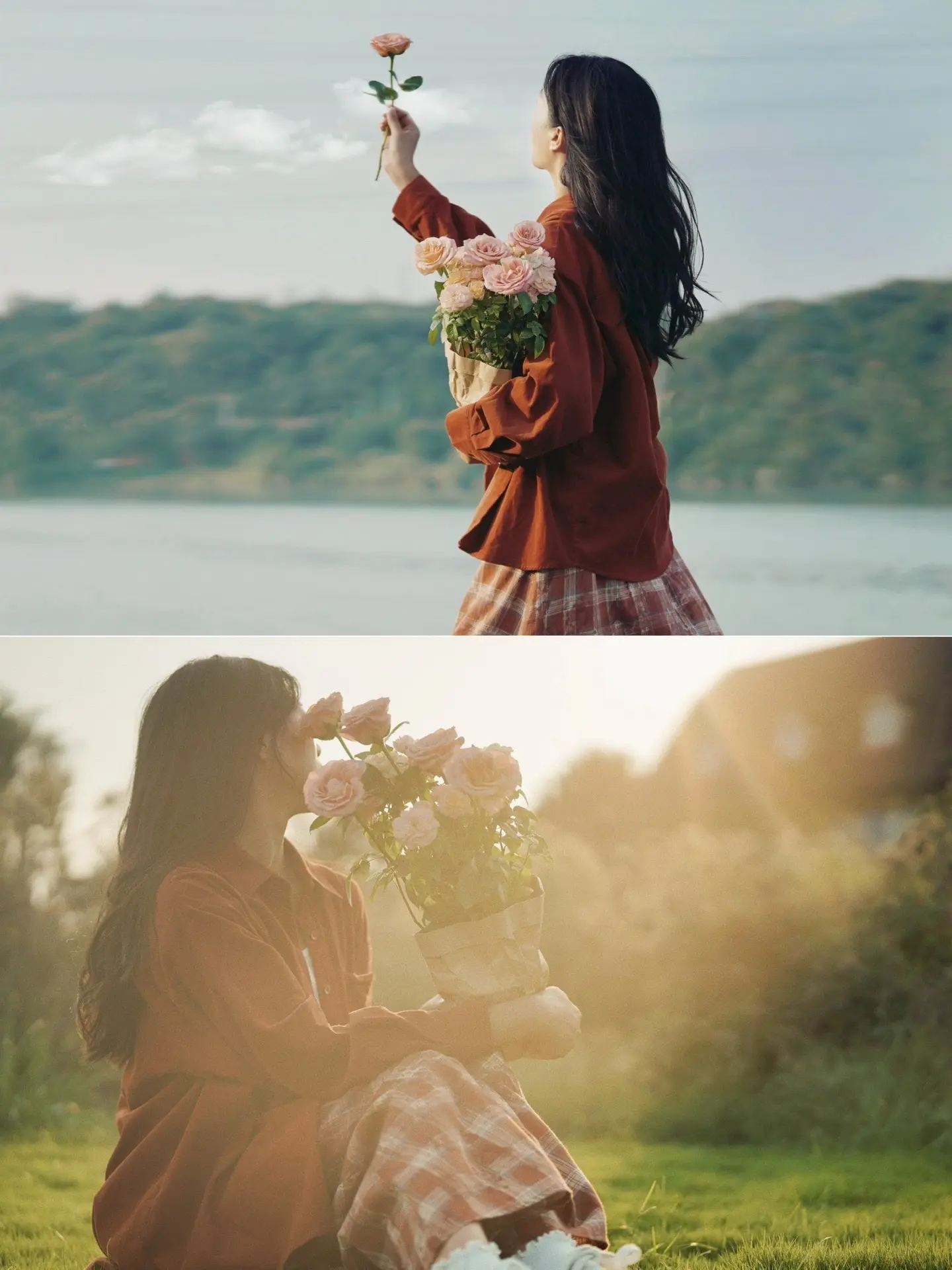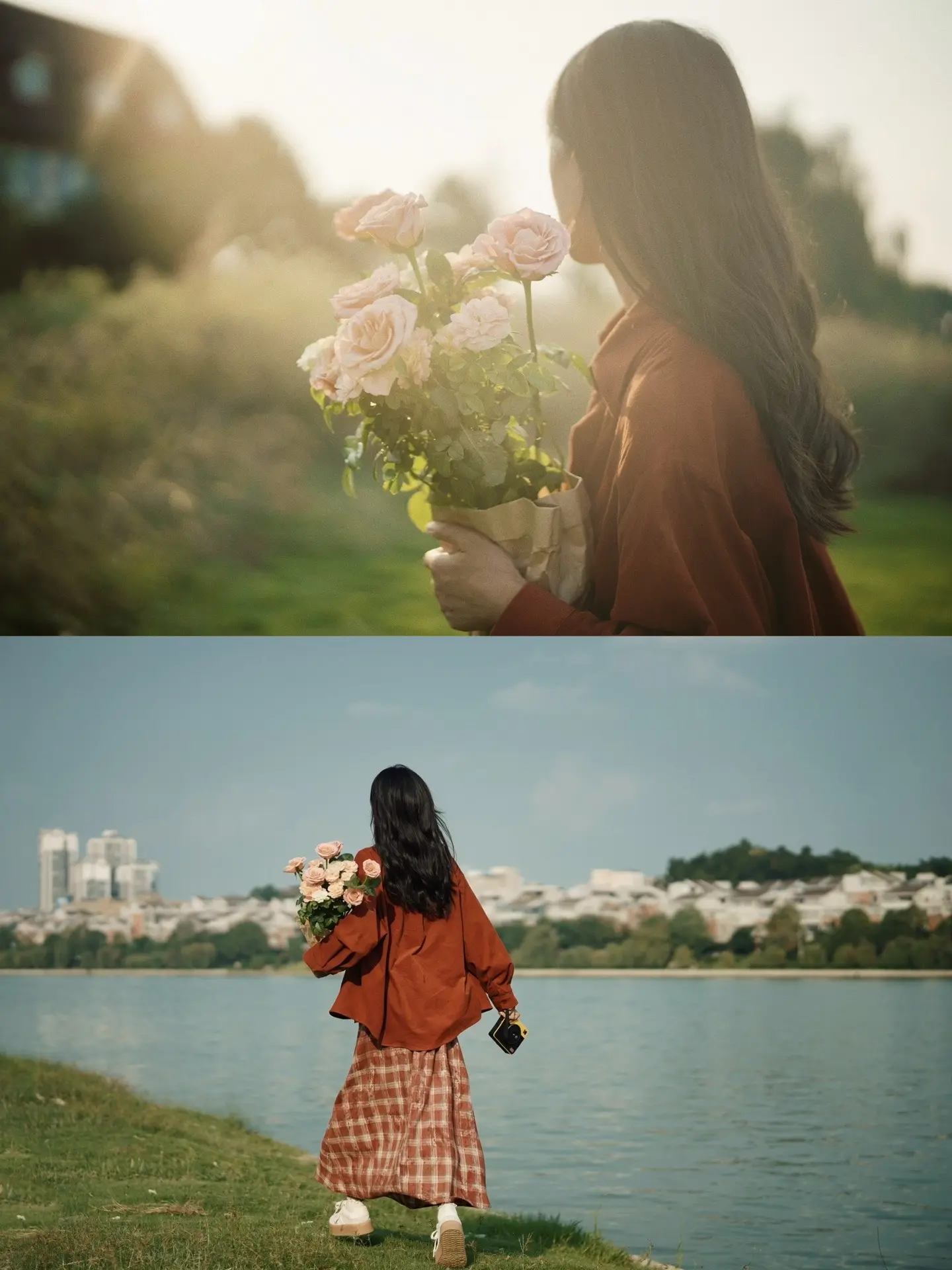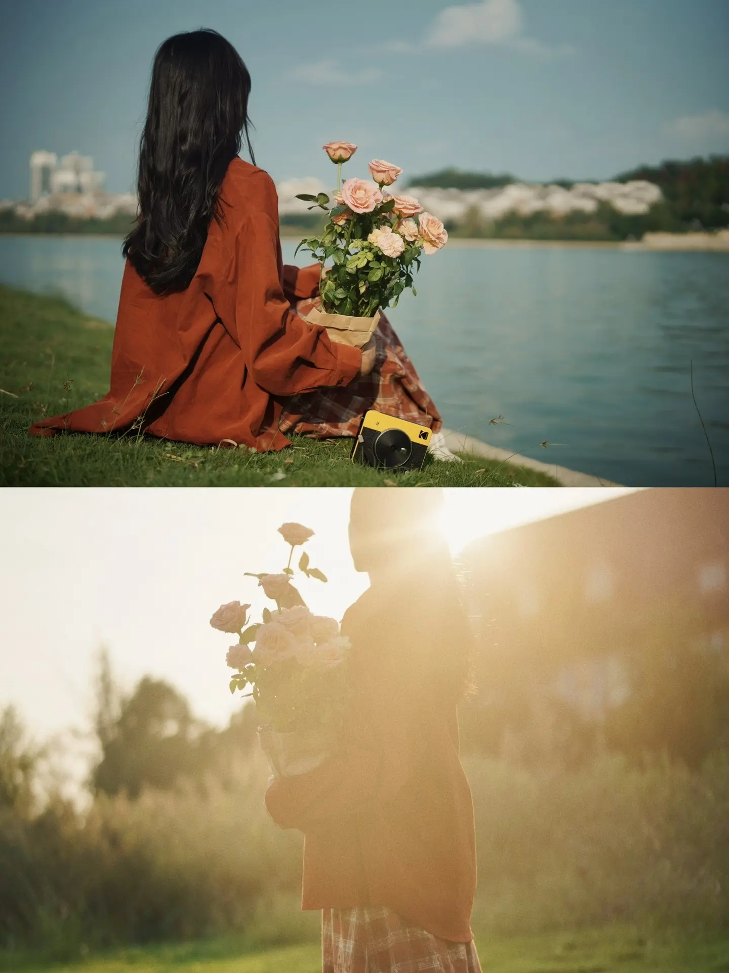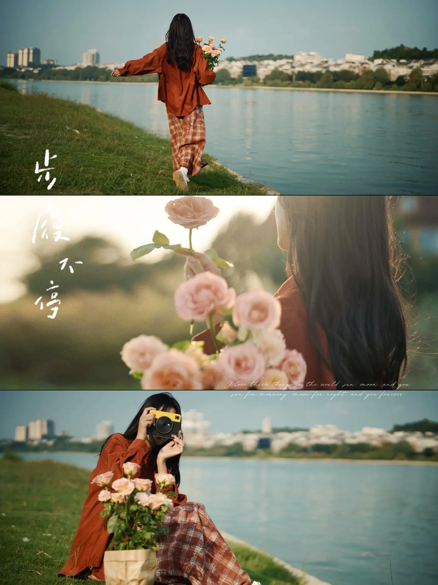 走在秋日湖边/郊游拍出文艺电影感。带了月季小盆栽当道具 花花有点稀疏,加几朵粉玫瑰进去 喜欢在傍晚时分拍照 在同一个场景里拍顺光和逆光的照片 Get 不一样的秋天~ /