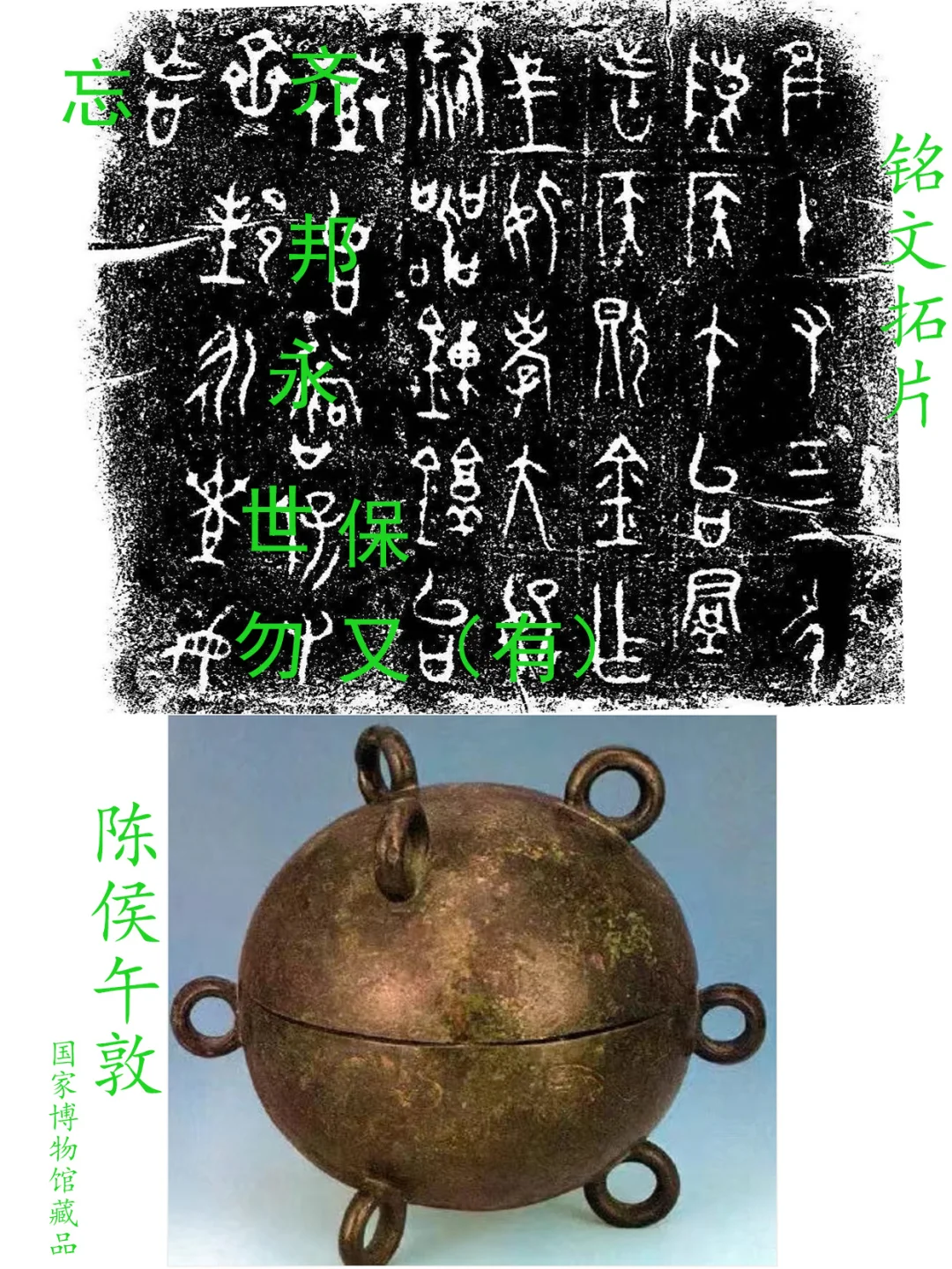 图六,春秋时期陈侯午敦铭文:保又(有)齐邦,永世勿忘。