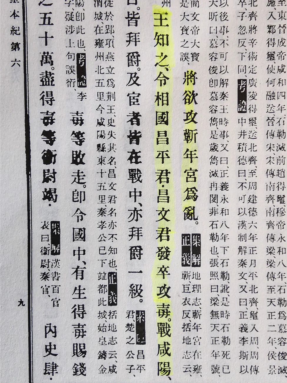 图二、《史记 秦始皇本纪》:(嬴政)王知之,令相国、昌平君、昌文君发卒攻毐(嫪毐),战咸阳。