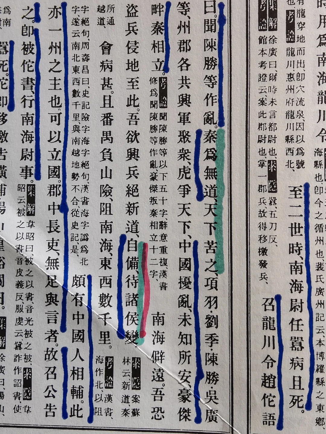 图八《史记 南越王列传》:(任嚣)召龙川令赵佗语,曰:闻陈胜等作乱,秦为无道,天下苦之。项羽、刘季、陈胜、吴广等州郡各共兴兵聚众,虎争天下。中国扰乱,未知所安~自备待诸侯变~颇有中国人相辅。