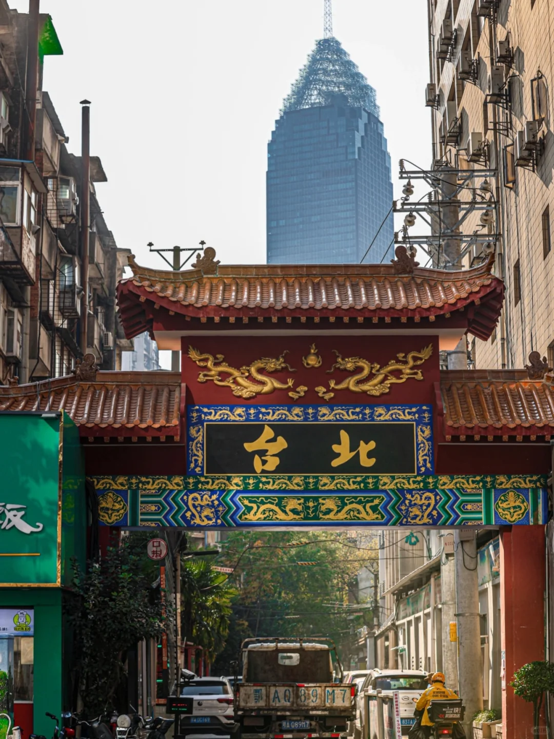 位于武汉万象城对面,有台北的牌坊,与后面的高层遥相呼应,古今同款