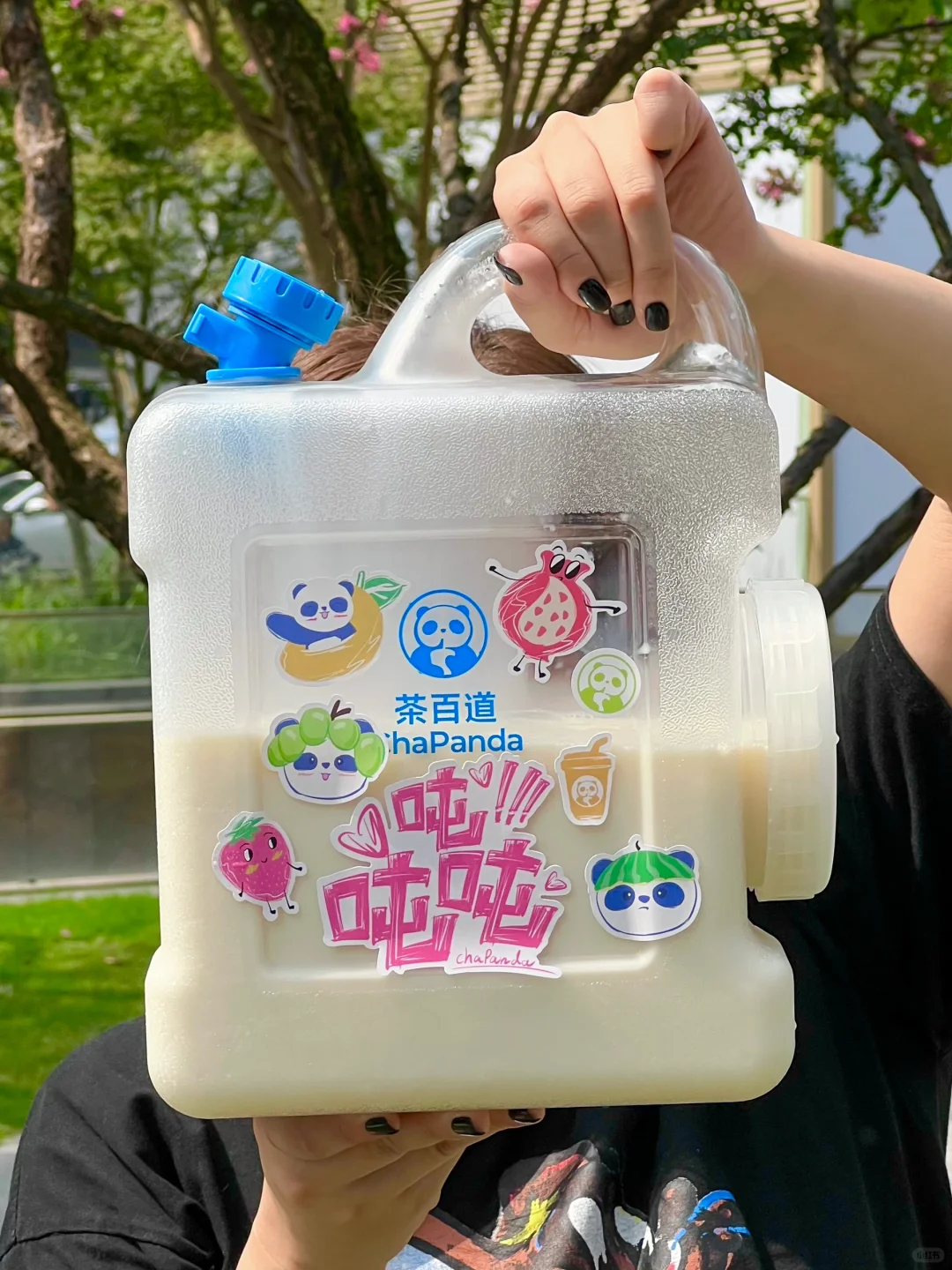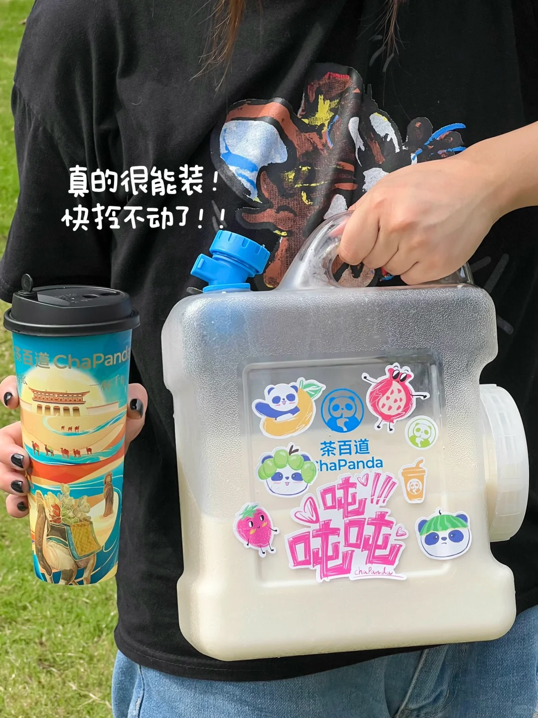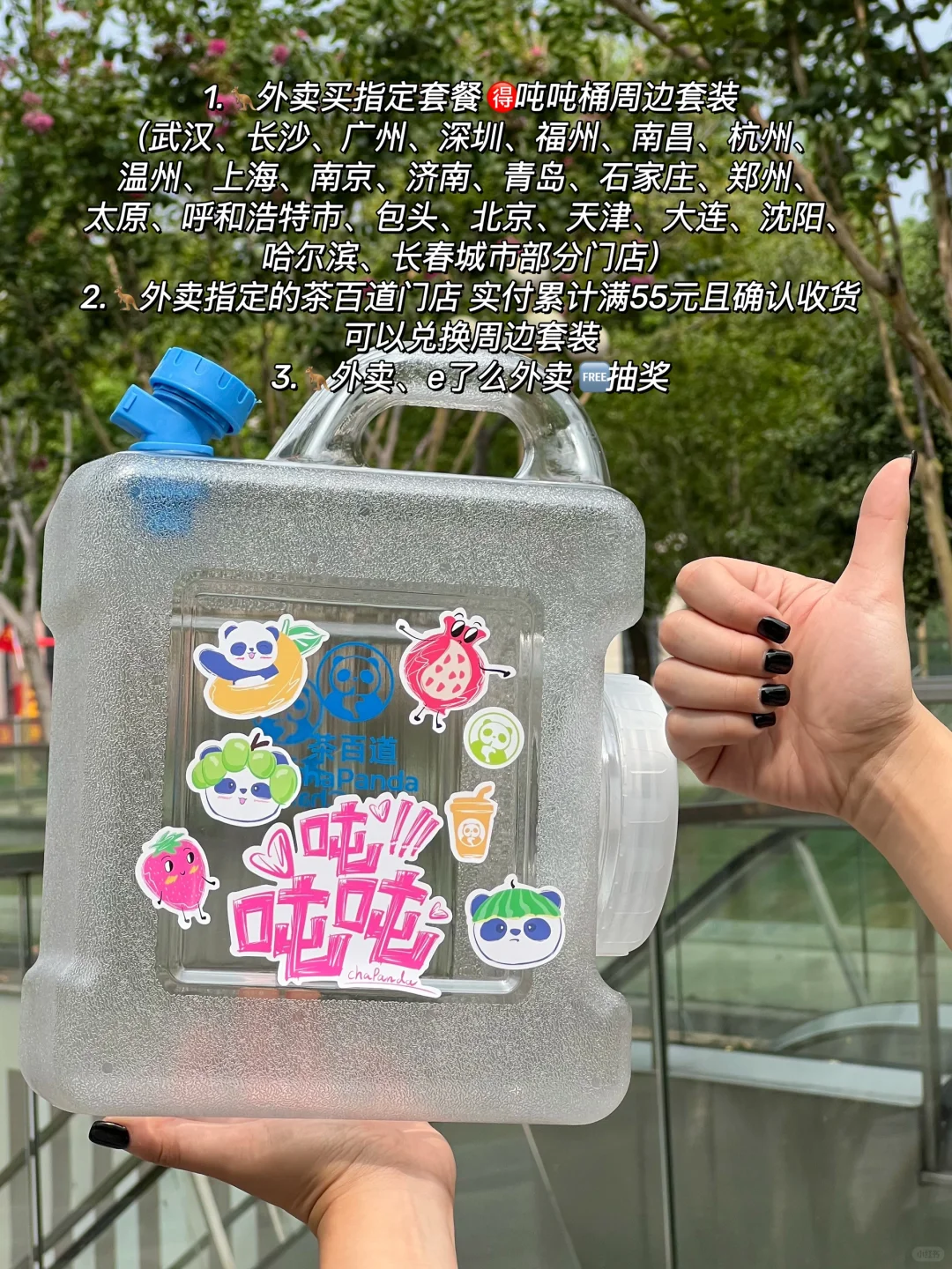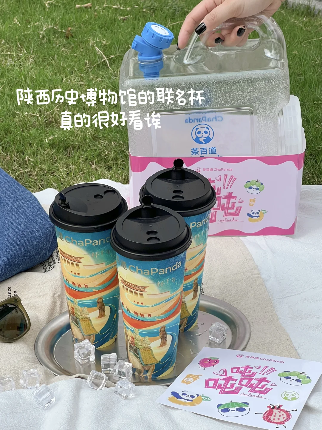 茶百道!你怎么知道国庆我要出去露营哈哈!这个吨吨桶刚好可以用上 不要太拉风奥~ 茶百道5L吨吨桶周边套装(包含腰封和贴纸)‼ ⏰10/1-10/8 ✔🦘外卖买指定套餐吨吨桶周边套装 ✔🦘外卖指定的茶百道门店 实付累计满55元且确认收货可以兑换周边套装 ✔🦘外卖、e了么外卖🆓抽奖 我们点了白月光茉莉奶绿 杯子还是和陕西历史博物馆联名的!三分糖正常冰🧊刚好!清香的茉莉味吼吼喝!