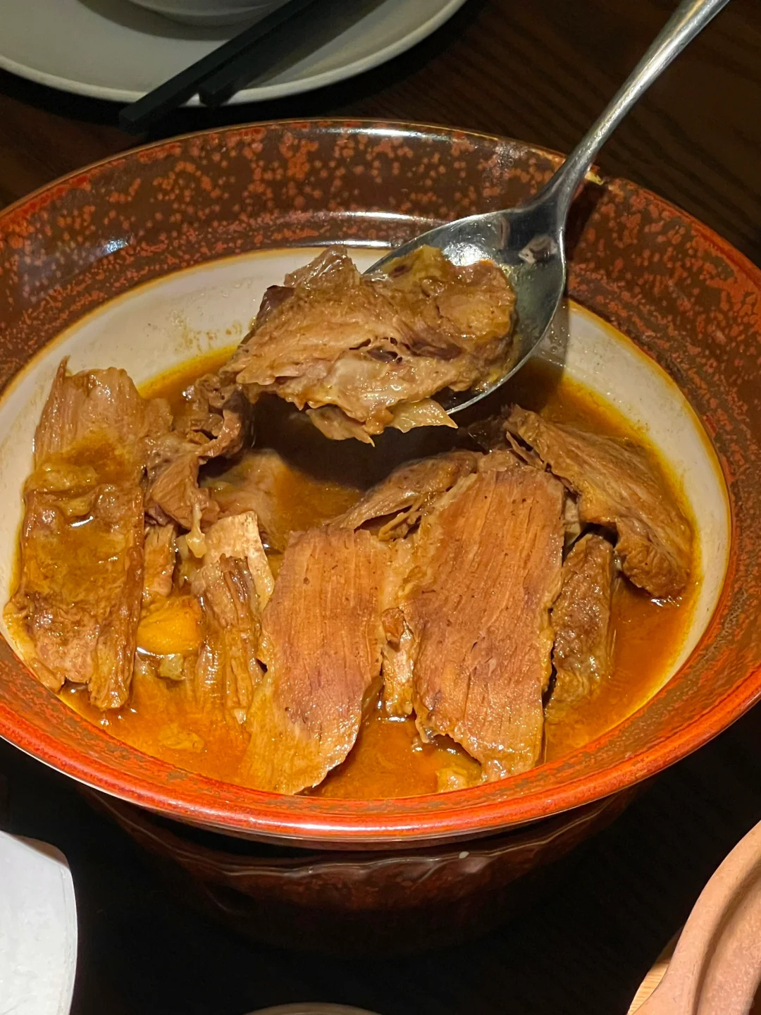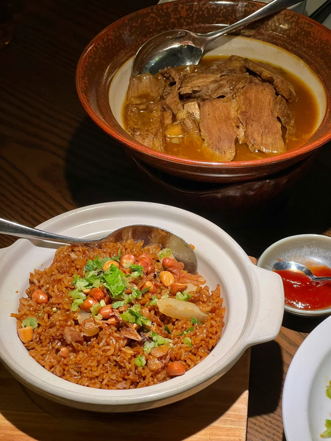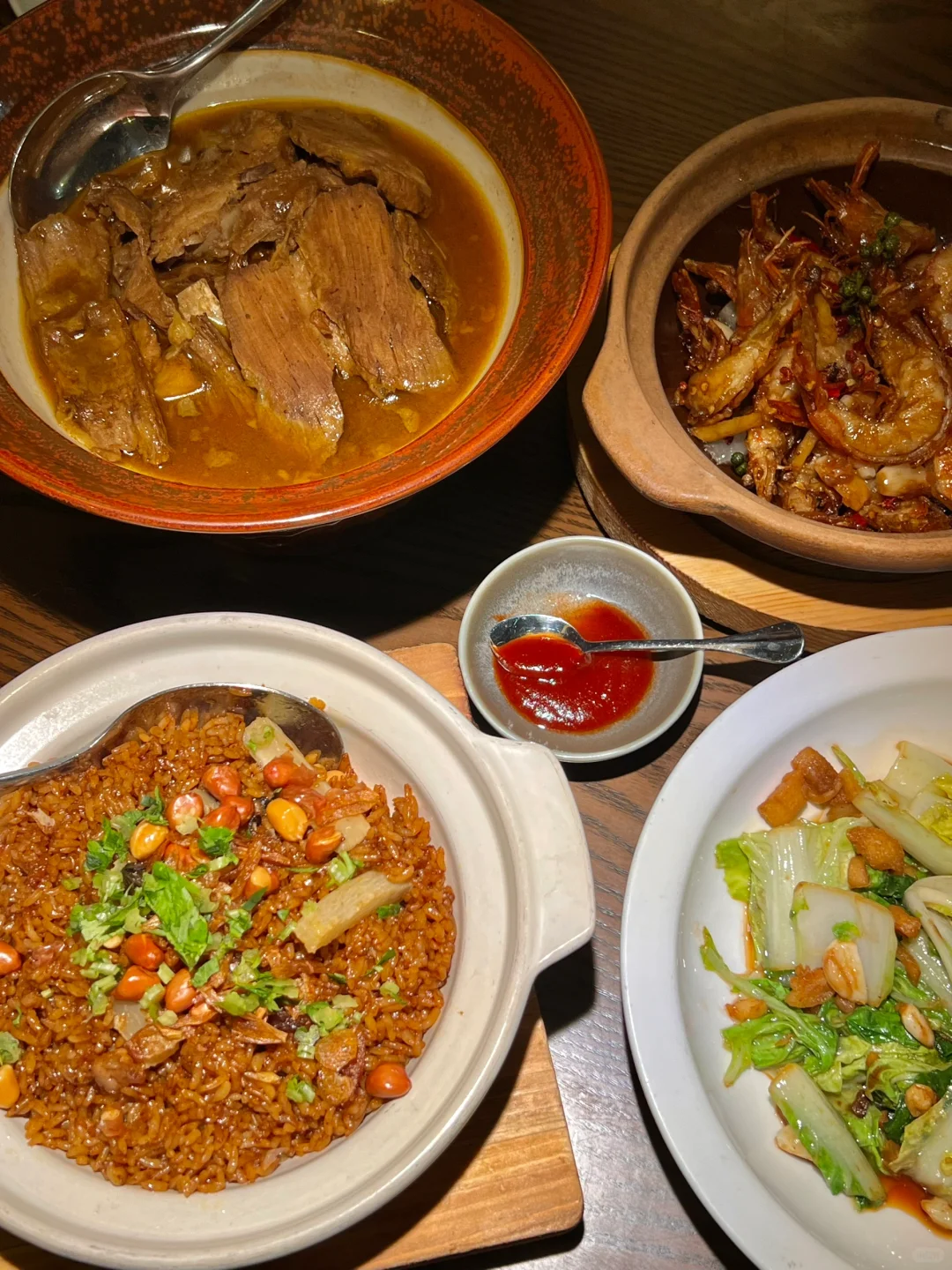 就在美罗城!!!周日三点都好多人啊啊啊… 特色牛排炖的软烂,甜咸口很地道!!萝卜炒饭干吃炒饭都很好吃,每一口都有五花肉和萝卜,炒的好香! 青花椒对虾🦐这个味道我太爱了!!青花椒麻麻辣辣,虾肉鲜香脆爽!吃第一口就被惊喜到了!!还有炒时蔬也很对我胃口,不油但香~ 果然上海会排队的店都很好吃啊!!!