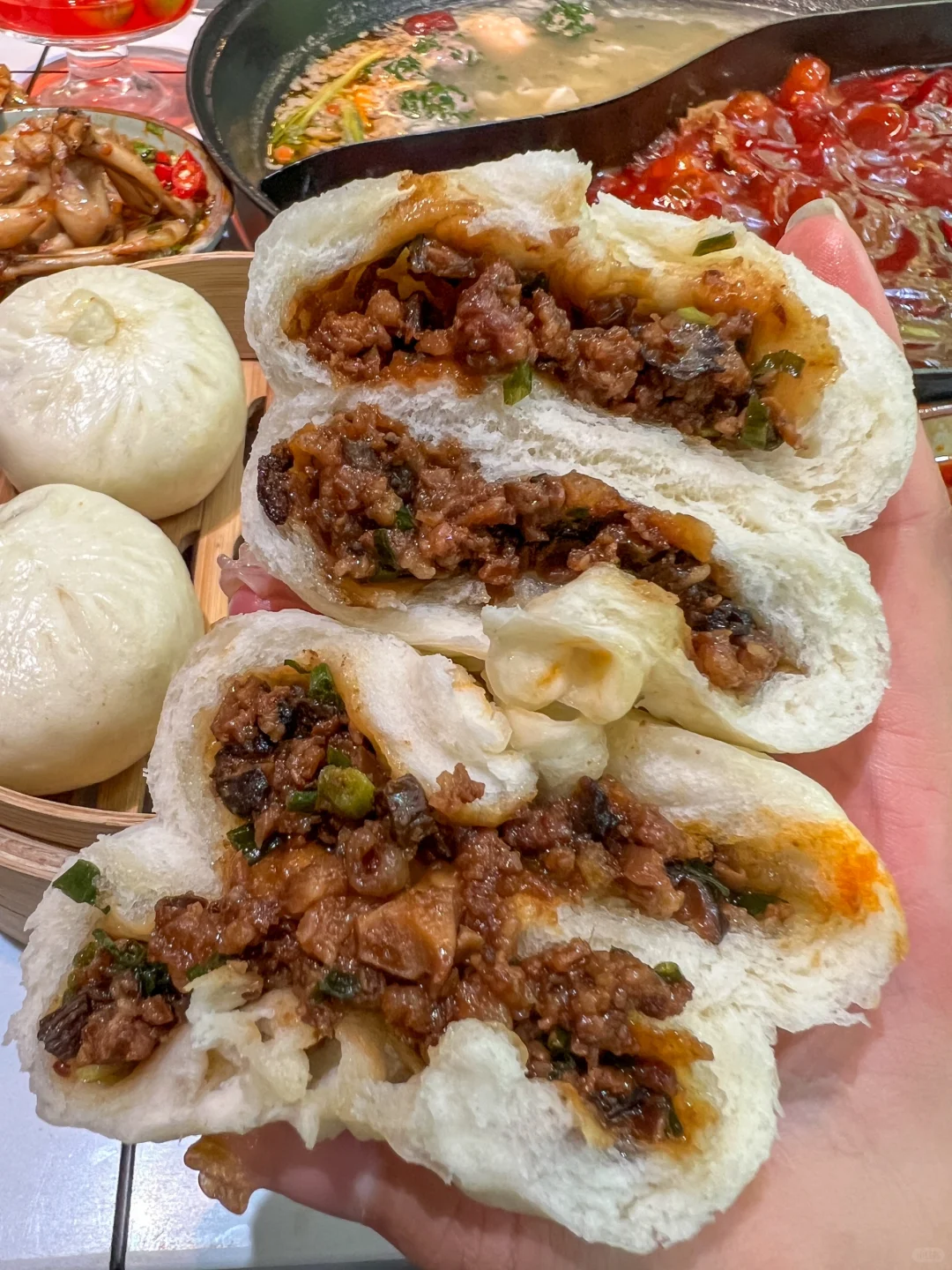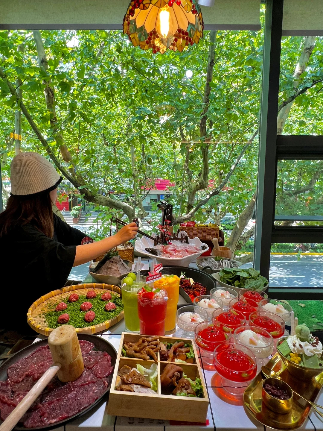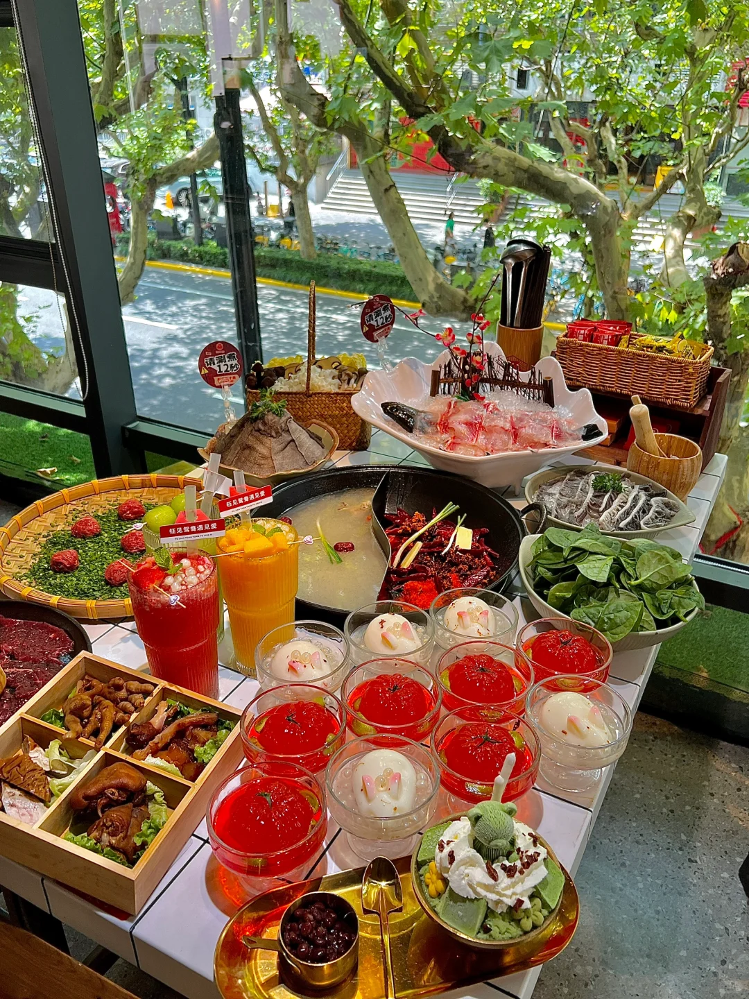 中山公园新开的重庆火锅好chill啊。。。。 花小钱装大杯🍷梧桐树下涮火锅好安逸!!!! 阿姨手工现包的包子我真的juju推荐!!! 香菇肉馅的,比外面早餐店卖的好吃多了!!! 还有新鲜现片的鱼片、锤子🔨牛肉、手打虾滑… 菜品的口味真的挑不出一点毛病!!!! 吃辣了店里还有很多饮料甜品🍮芒果🥭抹茶牛乳绵绵冰、duangduang的小奶冻….都很不错!!! 是我会推荐朋友们一直去吃的一家店!!!