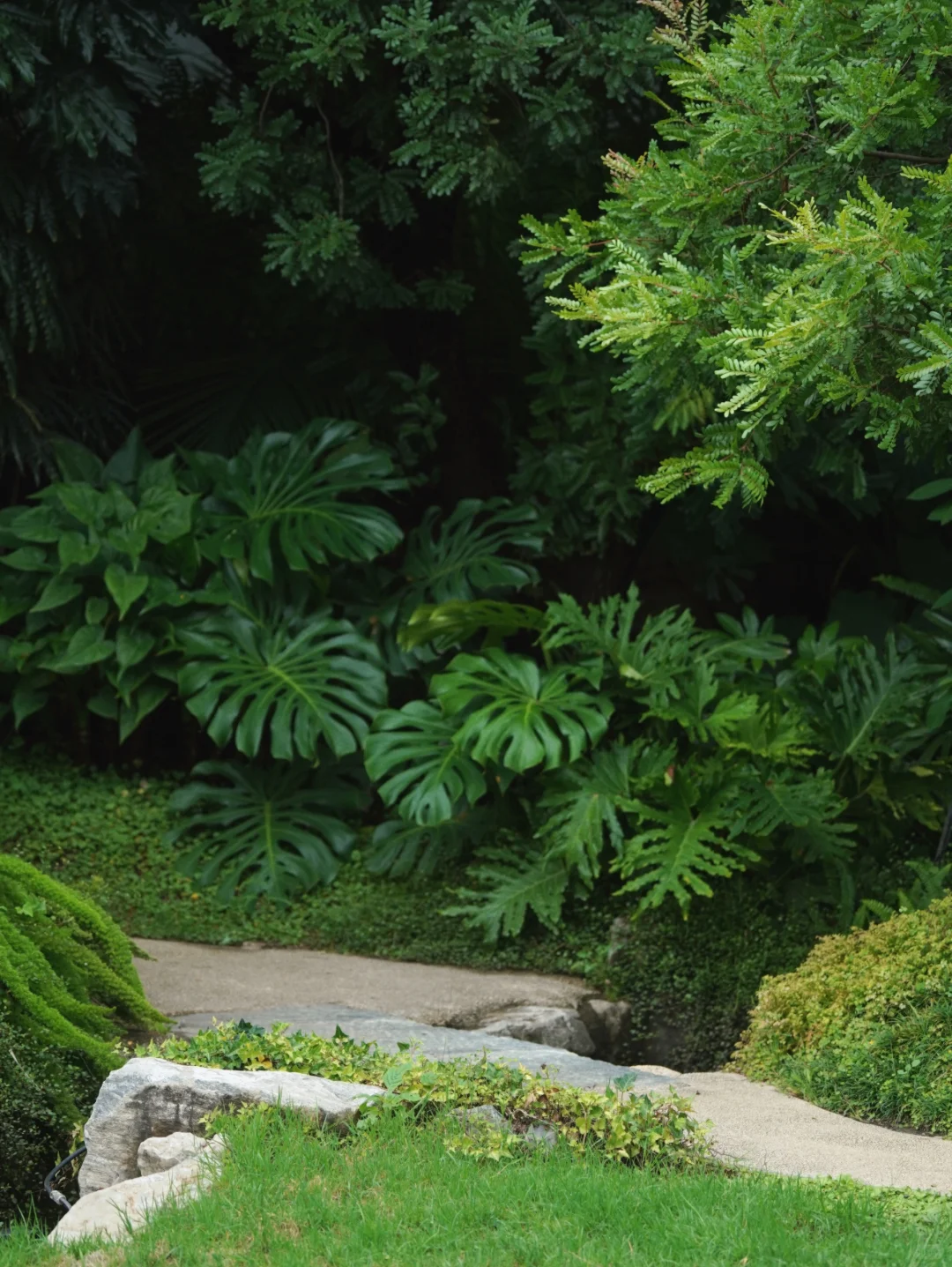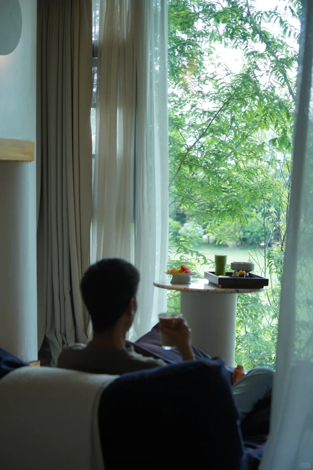 拉开窗帘满眼苍翠,刚下过雨的叶子还挂着水珠
