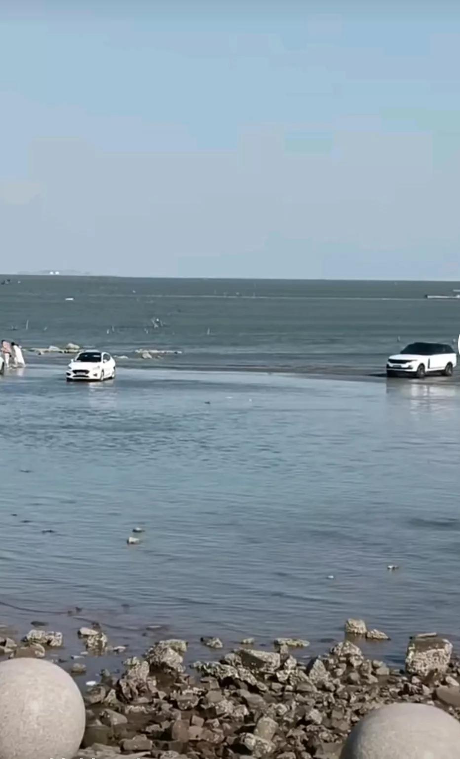 每年国庆节都看到有小汽车开到海滩上用海水洗车就为了省点洗车费用。国庆节海边走起 洗车也卷起来了