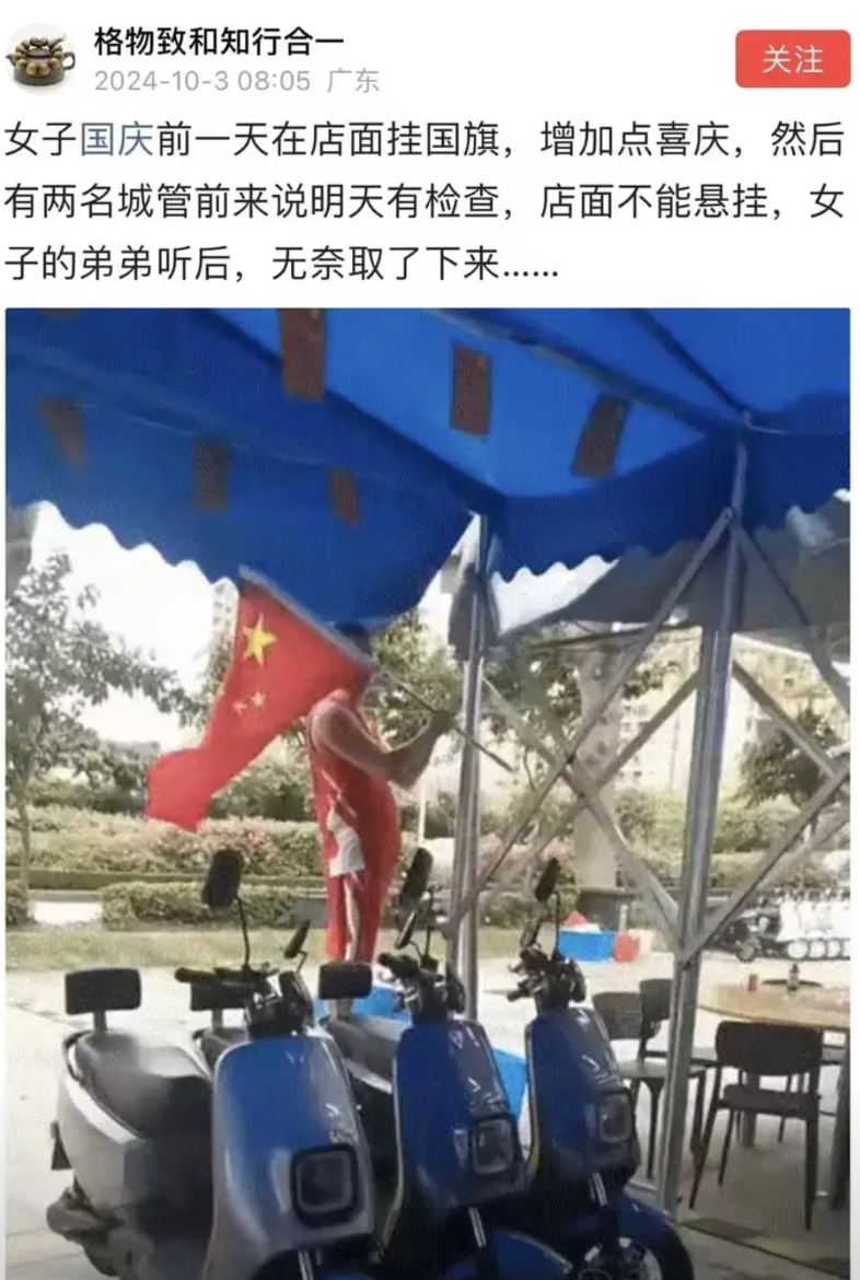 这一事件迅速引发了广泛讨论。许多网友对此表示不解,质疑物业的做法是否过于形式主义。国旗作为国家的象征,是每个公民的骄傲,店主在自己店门口挂国旗庆祝国庆,何错之有?难道为国庆表达一份喜悦之情,竟也会被视为“破坏美观”?