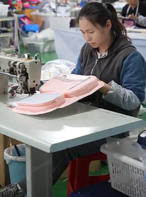 一个书包在出厂之前,经过的工序不下几十道。裁片、缝纫、锁边、质检、包装——每一道都在流水线上循环往复。做这些的人,大多是一双手、一台缝纫机,从早坐到晚。